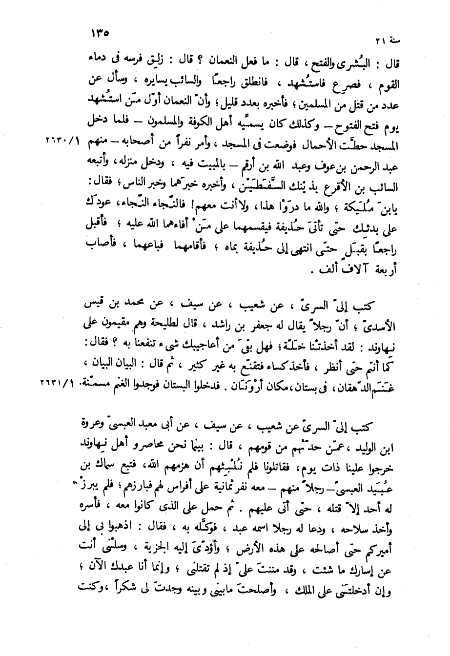 كَتَبَ إلي السري، عن شعيب، عن سيف، عن ابى معبد العبسى وعروه ابن الوليد، عمن حدثهم من قومهم، قال: بينما نحن محاصرو أهل نهاوند خرجوا علينا ذات يوم، فقاتلونا فلم نلبثهم أن هزمهم اللَّه، فتبع سماك بْن عبيد العبسي- رجلا منهم- معه نفر ثمانية على أفراس لهم فبارزهم، فلم يبرز له أحد إلا قتله، حتى أتى عليهم ثم حمل على الذي كانوا معه، فأسره وأخذ سلاحه، ودعا له رجلا اسمه عبد، فوكله به، فقال: اذهبوا بي إلى أميركم حتى أصالحه على هذه الأرض، وأؤدي إليه الجزية، وسلني أنت عن إسارك ما شئت، وقد مننت علي إذ لم تقتلني، وإنما أنا عبدك الآن، وإن أدخلتني على الملك، وأصلحت ما بيني وبينه وجدت لي شكرا، وكنت