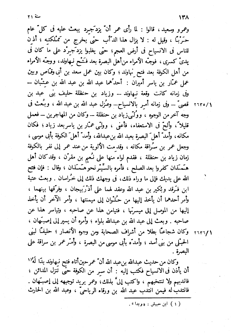 وعمرو وسعيد، قالوا: لما رأى عمر أن يزدجرد يبعث عليه في كل عام حربا، وقيل له: لا يزال هذا الدأب حتى يخرج من مملكته، أذن للناس في الانسياح في أرض العجم، حتى يغلبوا يزدجرد على ما كان في يدي كسرى، فوجه الأمراء من أهل البصرة بعد فتح نهاوند، ووجه الأمراء من أهل الكوفة بعد فتح نهاوند، وكان بين عمل سعد بْن أبي وقاص وبين عمل عمار بْن ياسر أميران: أحدهما عبد الله بن عبد الله بن عتبان- وفي زمانه كانت وقعة نهاوند- وزياد بْن حنظلة حليف بني عبد بْن قصي- وفي زمانه أمر بالانسياح- وعزل عبد اللَّه بْن عبد اللَّه، وبعث في وجه آخر من الوجوه، وولي زياد بْن حنظلة- وكان من المهاجرين- فعمل قليلا، وألح في الاستعفاء، فأعفي، وولي عمار بْن ياسر بعد زياد، فكان مكانه، وأمد أهل البصرة بعبد اللَّه بْن عبد اللَّه، وأمد أهل الكوفة بأبي موسى، وجعل عمر بْن سراقة مكانه، وقدمت الألوية من عند عمر إلى نفر بالكوفة زمان زياد بْن حنظلة، فقدم لواء منها على نعيم بْن مقرن، وقد كان أهل همذان كفروا بعد الصلح، فأمره بالسير نحو همذان، وقال: فإن فتح اللَّه على يديك فإلى ما وراء ذلك، في وجهك ذلك إلى خراسان وبعث عتبة ابن فرقد وبكير بْن عبد اللَّه وعقد لهما على أذربيجان، وفرقها بينهما، وأمر أحدهما أن يأخذ إليها من حلوان إلى ميمنتها، وأمر الآخر أن يأخذ إليها من الموصل إلى ميسرتها، فتيامن هذا عن صاحبه، وتياسر هذا عن صاحبه وبعث إلى عبد اللَّه بْن عبد اللَّه بلواء، وأمره أن يسير إلى إصبهان، وكان شجاعا بطلا من أشراف الصحابة ومن وجوه الأنصار، حليفا لبني الحبلى من بني أسد، وأمده بأبي موسى من البصرة، وأمر عمر بْن سراقة على البصرة.