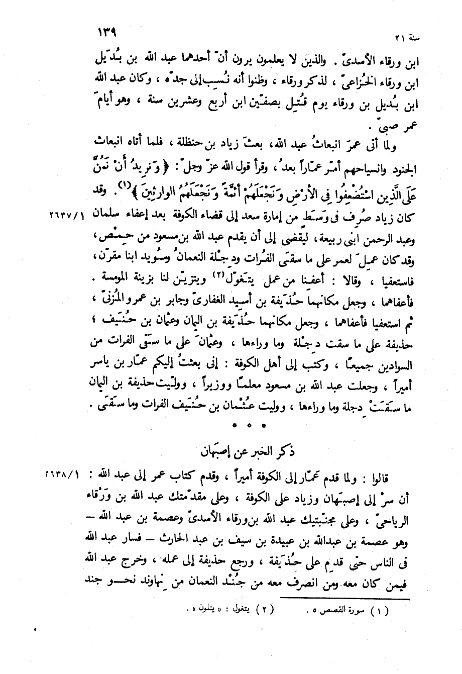 ابن ورقاء الأسدي والذين لا يعلمون يرون أن أحدهما عبد الله بن بديل ابن ورقاء الخزاعي، لذكر ورقاء، وظنوا أنه نسب الى جده، وكان عبد الله ابن بديل بْن ورقاء يوم قتل بصفين ابن أربع وعشرين سنة، وهو أيام عمر صبي ولما أتى عمر انبعاث عبد اللَّه، بعث زياد بْن حنظلة، فلما أتاه انبعاث الجنود وانسياحهم أمر عمارا بعد، وقرأ قول اللَّه عز وجل: «وَنُرِيدُ أَنْ نَمُنَّ عَلَى الَّذِينَ اسْتُضْعِفُوا فِي الْأَرْضِ وَنَجْعَلَهُمْ أَئِمَّةً وَنَجْعَلَهُمُ الْوارِثِينَ» وقد كان زياد صرف في وسط من إمارة سعد إلى قضاء الكوفة بعد إعفاء سلمان وعبد الرحمن ابني ربيعة، ليقضي إلى أن يقدم عبد اللَّه بْن مسعود من حمص، وقد كان عمل لعمر على ما سقى الفرات ودجلة النعمان وسويد ابنا مقرن، فاستعفيا، وقالا: أعفنا من عمل يتغول ويتزين لنا بزينة المومسة.