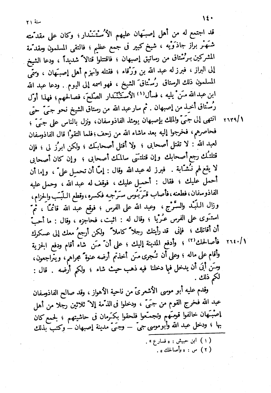 قد اجتمع له من أهل إصبهان عليهم الأستندار، وكان على مقدمته شهر براز جاذويه، شيخ كبير في جمع عظيم، فالتقى المسلمون ومقدمة المشركين برستاق من رساتيق إصبهان، فاقتتلوا قتالا شديدا، ودعا الشيخ إلى البراز، فبرز له عبد اللَّه بْن ورقاء، فقتله وانهزم أهل إصبهان، وسمى المسلمون ذلك الرستاق رستاق الشيخ، فهو اسمه إلى اليوم ودعا عبد الله ابن عبد اللَّه من يليه، فسأل الأستندار الصلح، فصالحهم، فهذا أول رستاق أخذ من إصبهان ثم سار عبد اللَّه من رستاق الشيخ نحو جي حتى انتهى إلى جي والملك بإصبهان يومئذ الفاذوسفان، ونزل بالناس على جي، فحاصرهم، فخرجوا إليه بعد ما شاء اللَّه من زحف، فلما التقوا قال الفاذوسفان لعبد اللَّه: لا تقتل أصحابي، ولا أقتل أصحابك، ولكن ابرز لي، فإن قتلتك رجع أصحابك وإن قتلتني سالمك أصحابي، وإن كان أصحابي لا يقع لهم نشابة فبرز له عبد اللَّه وقال: إما أن تحمل علي، وإما أن أحمل عليك، فقال: أحمل عليك، فوقف له عبد اللَّه، وحمل عليه الفاذوسفان، فطعنه، فأصاب قربوس سرجه فكسره، وقطع اللبب والحزام، وزال اللبد والسرج، وعبد اللَّه على الفرس، فوقع عبد اللَّه قائما، ثم استوى على الفرس عريا، وقال له: اثبت، فحاجزه، وقال: ما أحب أن أقاتلك، فإني قد رأيتك رجلا كاملا ولكن أرجع معك إلى عسكرك فأصالحك، وأدفع المدينة إليك، على أن من شاء أقام ودفع الجزية وأقام على ماله، وعلى أن تجرى من أخذتم أرضه عنوة مجراهم، ويتراجعون، ومن أبى أن يدخل فيما دخلنا فيه ذهب حيث شاء، ولكم أرضه قال: