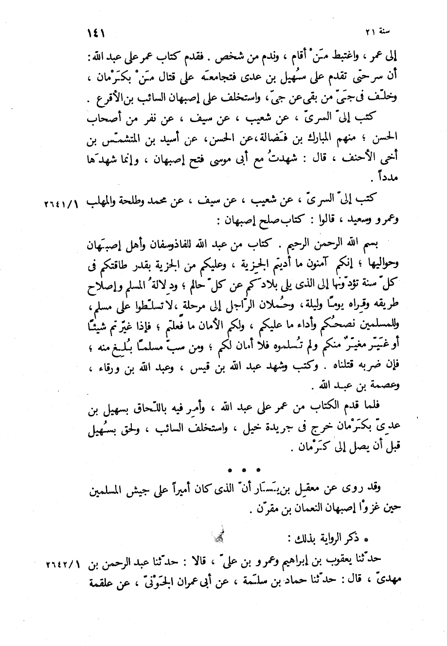 بسم اللَّه الرحمن الرحيم كتاب من عبد اللَّه للفاذوسفان وأهل إصبهان وحواليها، إنكم آمنون ما أديتم الجزية، وعليكم من الجزية بقدر طاقتكم في كل سنة تؤدونها إلى الذي يلي بلادكم عن كل حالم، ودلالة المسلم وإصلاح طريقه وقراه يوما وليلة، وحملان الراجل إلى مرحلة، لا تسلطوا على مسلم، وللمسلمين نصحكم وأداء ما عليكم، ولكم الأمان ما فعلتم، فإذا غيرتم شيئا او غير مغير منكم ولم تسلموه فلا أمان لكم، ومن سب مسلما بلغ منه، فإن ضربه قتلناه وكتب وشهد عبد اللَّه بْن قيس، وعبد اللَّه بْن ورقاء، وعصمة بْن عبد اللَّه.