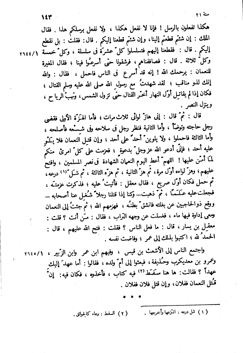 هكذا تفعلون بالرسل! فإنا لا نفعل هكذا، ولا نفعل برسلكم هذا فقال الملك: إن شئتم قطعتم إلينا، وإن شئتم قطعنا إليكم قال: فقلت: بل نقطع إليكم قال: فقطعنا إليهم فتسلسلوا كل عشرة في سلسلة، وكل خمسة وكل ثلاثة قال: فصاففناهم، فرشقونا حتى أسرعوا فينا، فقال المغيرة للنعمان: يرحمك اللَّه! إنه قد أسرع في الناس فاحمل، فقال: والله إنك لذو مناقب، لقد شهدت مع رسول الله ص القتال، فكان إذا لم يقاتل أول النهار أخر القتال حتى تزول الشمس، وتهب الرياح، وينزل النصر.