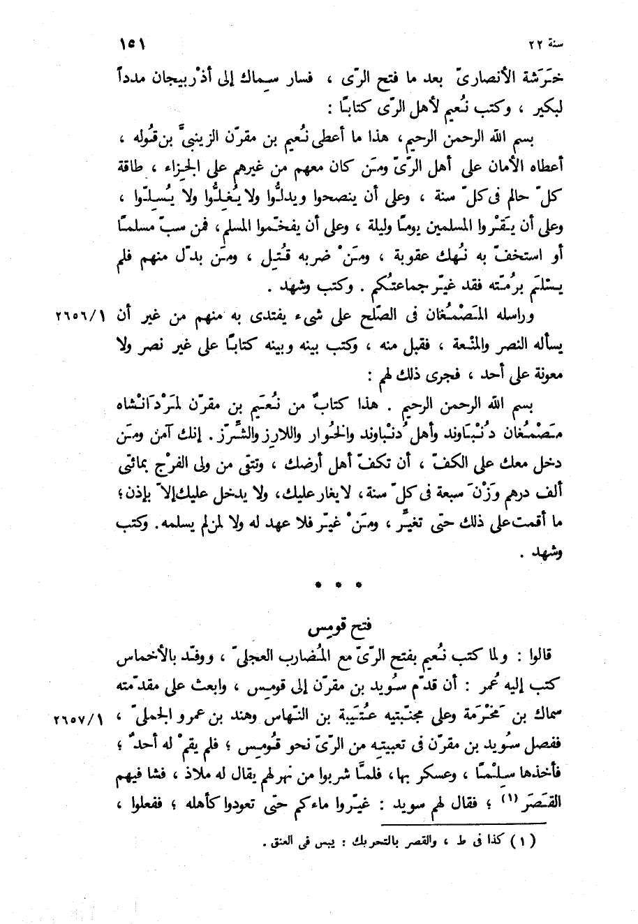 بسم اللَّه الرحمن الرحيم، هذا ما أعطى نعيم بْن مقرن الزينبي بْن قوله، أعطاه الأمان على أهل الري ومن كان معهم من غيرهم على الجزاء، طاقة كل حالم في كل سنة، وعلى أن ينصحوا ويدلوا ولا يغلوا ولا يسلوا، وعلى أن يقروا المسلمين يوما وليلة، وعلى أن يفخموا المسلم، فمن سب مسلما أو استخف به نهك عقوبة، ومن ضربه قتل، ومن بدل منهم فلم يسلم برمته فقد غير جماعتكم وكتب وشهد وراسله المصمغان في الصلح على شيء يفتدى به منهم من غير أن يسأله النصر والمنعة، فقبل منه، وكتب بينه وبينه كتابا على غير نصر ولا معونة على أحد، فجرى ذلك لهم: