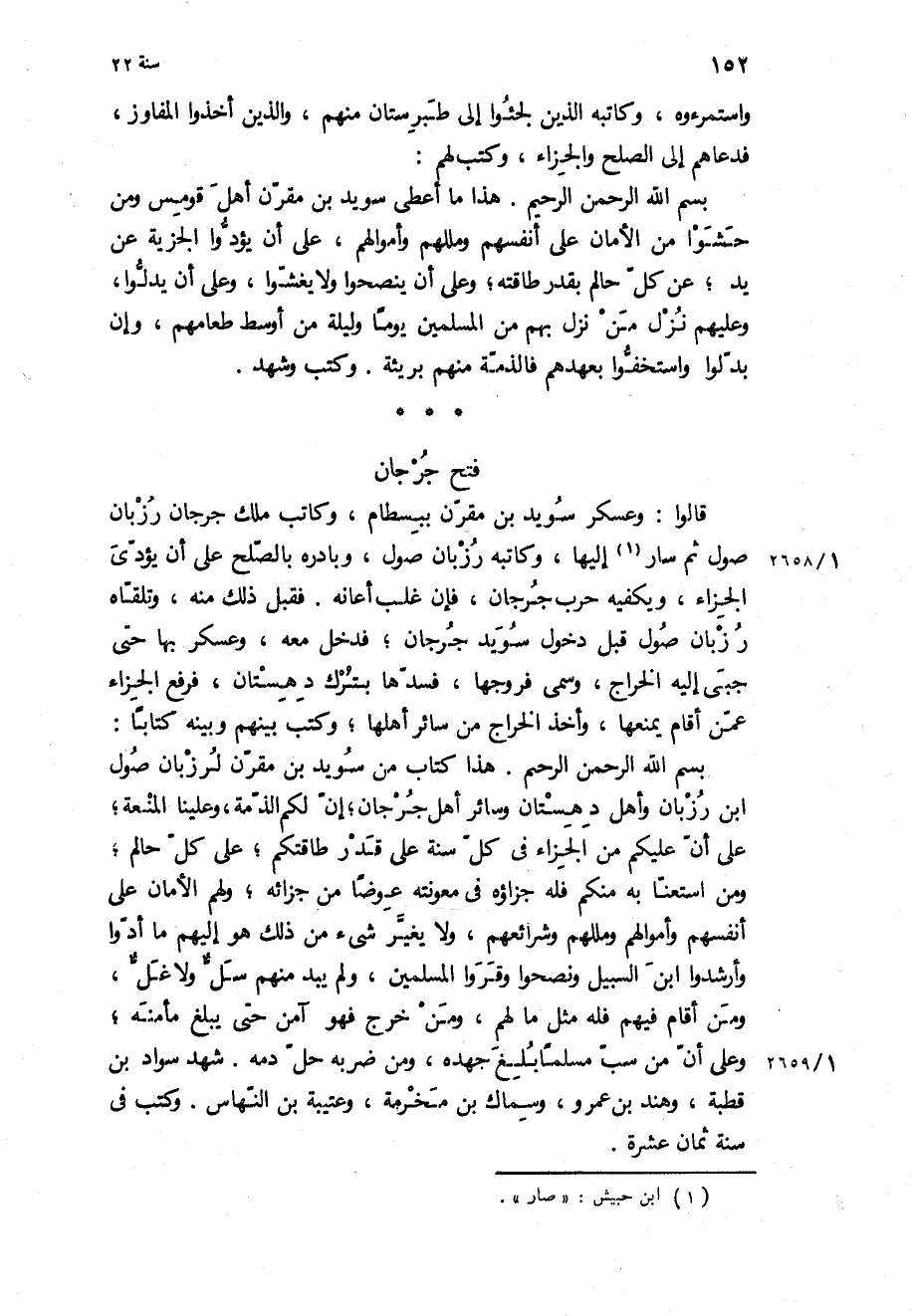 بسم اللَّه الرحمن الرحيم هذا ما أعطى سويد بْن مقرن أهل قومس ومن حشوا من الأمان على أنفسهم ومللهم وأموالهم، على أن يؤدوا الجزية عن يد، عن كل حالم بقدر طاقته، وعلى أن ينصحوا ولا يغشوا، وعلى أن يدلوا، وعليهم نزل من نزل بهم من المسلمين يوما وليلة من أوسط طعامهم، وإن بدلوا واستخفوا بعهدهم فالذمة منهم بريئة وكتب وشهد.