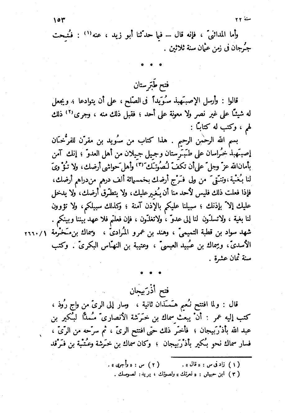 بِسْمِ اللَّه الرَّحْمَنِ الرَّحِيمِ هَذَا كِتَابٌ مِنْ سويد بْن مقرن للفرخان إصبهبذ خراسان على طبرستان وجيل جيلان من أهل العدو، إنك آمن بأمان اللَّه عز وجل على أن تكف لصوتك وأهل حواشي أرضك، ولا تؤوى لنا بغيه، وتنقى من ولى فرج أرضك بخمسمائة ألف درهم من دراهم أرضك، فإذا فعلت ذلك فليس لأحد منا أن يغير عليك، ولا يتطرق أرضك، ولا يدخل عليك إلا بإذنك، سبيلنا عليكم بالإذن آمنة، وكذلك سبيلكم، ولا تؤوون لنا بغية، ولا تسلون لنا إلى عدو، ولا تغلون، فإن فعلتم فلا عهد بيننا وبينكم شهد سواد بْن قطبة التميمي، وهند بْن عمرو المرادي، وسماك بْن مخرمة الأسدي، وسماك بن عبيد العبسى، وعتيبة بن النهاس البكرى وكتب سنه ثمان عشرة.