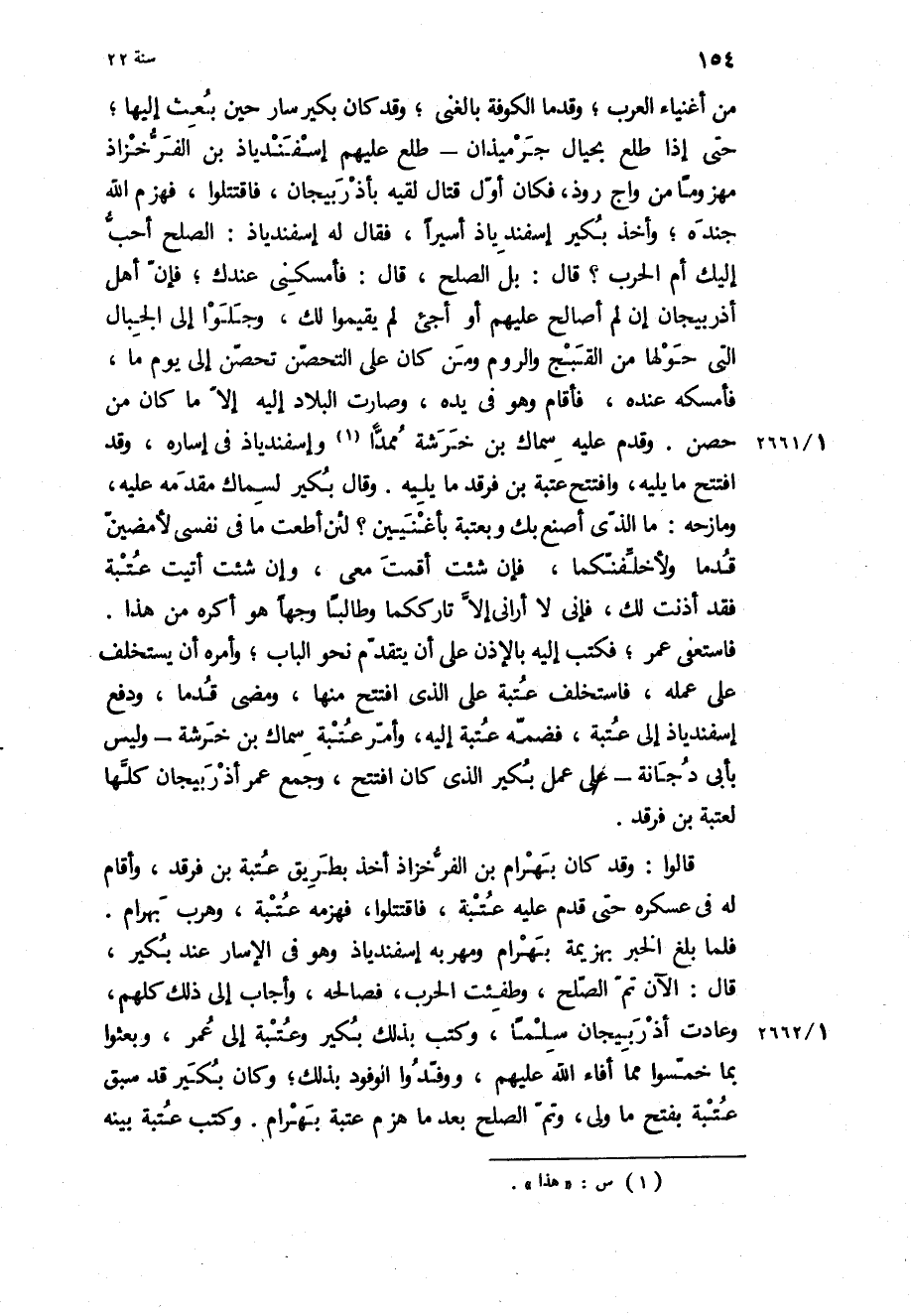 من أغنياء العرب، وقدما الكوفة بالغنى، وقد كان بكير سار حين بعث إليها، حتى إذا طلع بحيال جرميذان- طلع عليهم إسفندياذ بن الفرخزاد مهزوما من واج روذ، فكان أول قتال لقيه بأذربيجان، فاقتتلوا، فهزم اللَّه جنده، وأخذ بكير إسفندياذ أسيرا، فقال له إسفندياذ: الصلح أحب إليك أم الحرب؟ قال: بل الصلح، قال: فأمسكني عندك، فإن أهل أذربيجان إن لم اصالح عليهم او أجيء لم يقيموا لك، وجلوا إلى الجبال التي حولها من القبج والروم ومن كان على التحصن تحصن إلى يوم ما، فأمسكه عنده، فأقام وهو في يده، وصارت البلاد إليه إلا ما كان من حصن وقدم عليه سماك بْن خرشة ممدا وإسفندياذ في إساره، وقد افتتح ما يليه، وافتتح عتبة بْن فرقد ما يليه وقال بكير لسماك مقدمه عليه، ومازحه: ما الذي أصنع بك وبعتبة بأغنيين؟ لئن أطعت ما في نفسي لأمضين قدما ولأخلفنكما، فإن شئت أقمت معي، وإن شئت أتيت عتبة فقد أذنت لك، فإني لا أراني إلا تارككما وطالبا وجها هو أكره من هذا.