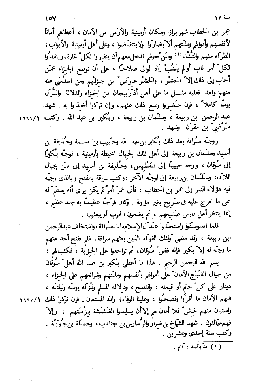 عمر بن الخطاب شهربراز وسكان أرمينية والأرمن من الأمان، أعطاهم أمانا لأنفسهم وأموالهم وملتهم الا يضاروا ولا ينتقضوا، وعلى اهل أرمينية والأبواب، الطراء منهم والتناء ومن حولهم فدخل معهم أن ينفروا لكل غارة، وينفذوا لكل أمر ناب أو لم ينسب رآه الوالي صلاحا، على أن توضع الجزاء عمن أجاب إلى ذلك إلا الحشر، والحشر عوض من جزائهم ومن استغنى عنه منهم وقعد فعليه مثل ما على أهل أذربيجان من الجزاء والدلالة والنزل يوما كاملا، فإن حشروا وضع ذلك عنهم، وإن تركوا أخذوا به شهد عبد الرحمن بْن ربيعة، وسلمان بْن ربيعة، وبكير بْن عبد اللَّه وكتب مرضي بْن مقرن وشهد ووجه سراقة بعد ذلك بكير بْن عبد اللَّه وحبيب بْن مسلمة وحذيفة بْن أسيد وسلمان بْن ربيعة إلى أهل تلك الجبال المحيطة بأرمينية، فوجه بكيرا إلى موقان، ووجه حبيبا إلى تفليس، وحذيفة بْن أسيد إلى من بجبال اللان، وسلمان بْن ربيعة إلى الوجه الآخر، وكتب سراقة بالفتح وبالذي وجه فيه هؤلاء النفر إلى عمر بْن الخطاب، فأتى عمر أمر لم يكن يرى أنه يستتم له على ما خرج عليه في سريح بغير مئونة وكان فرجا عظيما به جند عظيم، إنما ينتظر أهل فارس صنيعهم، ثم يضعون الحرب أو يبعثونها.