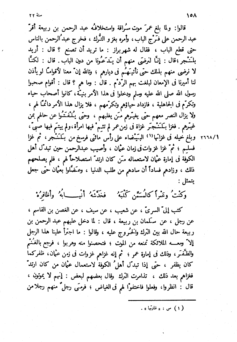 كَتَبَ إِلَيَّ السَّرِيُّ، عَنْ شُعَيْبٍ، عَنْ سيف، عن الغصن بن القاسم، عن رجل، عن سلمان بْن ربيعة، قال: لما دخل عليهم عبد الرحمن بْن ربيعة حال اللَّه بين الترك والخروج عليه، وقالوا: ما اجترأ علينا هذا الرجل الا ومعه الملائكة تمنعه من الموت، فتحصنوا منه وهربوا، فرجع بالغنم والظفر، وذلك في إمارة عمر، ثم إنه غزاهم غزوات في زمن عثمان، ظفر كما كان يظفر، حتى إذا تبدل أهل الكوفة لاستعمال عثمان من كان ارتد فغزاهم بعد ذلك، تذامرت الترك وقال بعضهم لبعض: إنهم لا يموتون، قال: انظروا، وفعلوا فاختفوا لهم في الغياض، فرمى رجل منهم رجلا من