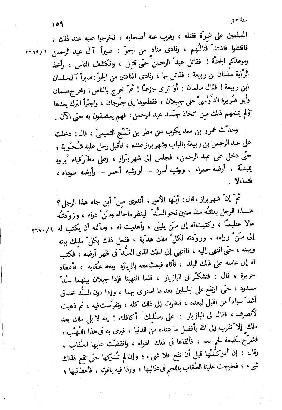 المسلمين على غرة فقتله، وهرب عنه أصحابه، فخرجوا عليه عند ذلك، فاقتتلوا فاشتد قتالهم، ونادى مناد من الجو: صبرا آل عبد الرحمن وموعدكم الجنة! فقاتل عبد الرحمن حتى قتل، وانكشف الناس، وأخذ الراية سلمان بْن ربيعة، فقاتل بها، ونادى المنادي من الجو: صبرا آل سلمان ابن ربيعة! فقال سلمان: أو ترى جزعا! ثم خرج بالناس، وخرج سلمان وأبو هريرة الدوسي على جيلان، فقطعوها إلى جرجان، واجترأ الترك بعدها ولم يمنعهم ذلك من اتخاذ جسد عبد الرحمن، فهم يستسقون به حتى الآن.