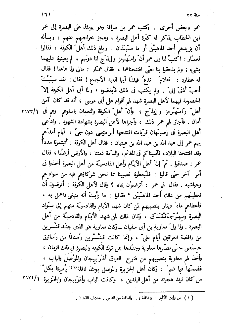 عُمَرَ وَبَعْضَ أُخْرَى وَكَتَبَ عُمَرُ بْنُ سُرَاقَةَ وهو يومئذ على البصره الى عمر ابن الْخَطَّابِ يَذْكُرُ لَهُ كَثْرَةَ أَهْلِ الْبَصْرَةِ، وَعَجْزَ خَرَاجِهِمْ عَنْهُمْ، وَيَسْأَلُهُ أَنْ يُزِيدَهُمْ أَحَدَ الْمَاهَيْنِ أَوْ مَاسَبَذَانَ وَبَلَغَ ذَلِكَ أَهْلَ الْكُوفَةِ، فَقَالُوا لِعَمَّارٍ: اكْتُبْ لَنَا إِلَى عُمَرَ أَنَّ رَامَهُرْمُزَ وَإِيذَجَ لَنَا دُونَهُمْ، لَمْ يُعِينُونَا عَلَيْهِمَا بِشَيْءٍ، وَلَمْ يَلْحَقُوا بِنَا حَتَّى افْتَتَحْنَاهُمَا، فَقَالَ عَمَّارٌ: مَا لِي وَلِمَا هَاهُنَا! فَقَالَ لَهُ عُطَارِدٌ: فَعَلامَ تَدَعُ فَيْئَنَا أَيُّهَا الْعَبْدُ الأَجْدَعُ! فَقَالَ: لَقَدْ سَبَبْتَ أَحَبَّ أُذُنَيَّ إِلَيَّ وَلَمْ يَكْتُبْ فِي ذَلِكَ فَأَبْغَضُوهُ، وَلَمَّا أَبَى أَهْلُ الْكُوفَةِ إِلا الْخُصُومَةَ فِيهِمَا لأَهْلِ الْبَصْرَةِ شَهِدَ لَهُمْ أَقْوَامٌ عَلَى أَبِي مُوسَى، أَنَّهُ قَدْ كَانَ أَمَّنَ أَهْلَ رَامَهُرْمُزَ وَإِيذَجَ، وَأَنَّ أَهْلَ الْكُوفَةِ وَالنُّعْمَانِ رَاسَلُوهُمْ وَهُمْ فِي أَمَانٍ فَأَجَازَ لَهُمْ عُمَرُ ذَلِكَ، وَأَجْرَاهَا لأَهْلِ الْبَصْرَةِ بِشَهَادَةِ الشُّهُودِ وَادَّعَى أَهْلُ الْبَصْرَةِ فِي إِصْبَهَانَ قَرْيَاتٍ افْتَتَحَهَا أَبُو مُوسَى دُونَ جَيٍّ، أَيَّامَ أَمَدَّهُمْ بِهِمْ عُمَرُ إِلَى عَبْدِ اللَّه بْن عَبْدِ اللَّه بْنِ عُتْبَانَ، فَقَالَ أَهْلُ الْكُوفَةِ: أَتَيْتُمُونَا مَدَدًا وَقَدِ افْتَتَحْنَا الْبِلادَ، فَآسَيْنَاكُمْ فِي الْمَغَانِمِ، وَالذِّمَّةُ ذِمَّتُنَا، وَالأَرْضُ أَرْضُنَا، فَقَالَ عُمَرُ: صَدَقُوا ثُمَّ إِنَّ أَهْلَ الأَيَّامِ وَأَهْلَ الْقَادِسِيَّةِ مِنْ أَهْلِ الْبَصْرَةِ أَخَذُوا فِي أَمْرٍ آخَرَ حَتَّى قَالُوا: فَلْيُعْطُونَا نَصِيبَنَا مِمَّا نَحْنُ شُرَكَاؤُهُمْ فِيهِ مِنْ سَوَادِهِمْ وَحَوَاشِيهِ فَقَالَ لَهُمْ عُمَرُ: أَتَرْضَوْنَ بِمَاهٍ؟ وَقَالَ لأَهْلِ الْكُوفَةِ: أَتَرْضَوْنَ أَنْ نُعْطِيَهُمْ مِنْ ذَلِكَ أَحَدِ الْمَاهَيْنِ؟ فَقَالُوا: مَا رَأَيْتَ أَنَّهُ يَنْبَغِي فَاعْمَلْ بِهِ، فَأَعْطَاهُمْ مَاهَ دِينَارٍ بِنَصِيبِهِمْ لِمَنْ كَانَ شَهِدَ الأَيَّامَ وَالْقَادِسِيَّةَ مِنْهُمْ إِلَى سواد البصره ومهرجانقذق، وَكَانَ ذَلِكَ لِمَنْ شَهِدَ الأَيَّامَ وَالْقَادِسِيَّةَ مِنْ أَهْلِ الْبَصْرَةِ وَلَمَّا وَلِيَ مُعَاوِيَةُ بْنُ أَبِي سُفْيَانَ- وَكَانَ مُعَاوِيَةُ هُوَ الَّذِي جَنَّدَ قِنَّسْرِينَ من رافضه العراقين ايام على، وانما كانت قنسرين رستاقا مِنْ رَسَاتِيقِ حِمْصَ حَتَّى مَصَّرَهَا مُعَاوِيَةُ وَجَنَّدَهَا بمن ترك الْكُوفَةَ وَالْبَصْرَةَ فِي ذَلِكَ الزَّمَانِ، وَأَخَذَ لَهُمْ مُعَاوِيَةُ بِنَصِيبِهِمْ مِنْ فُتُوحِ الْعِرَاقِ أَذْرَبَيْجَانَ وَالْمَوْصِلَ وَالْبَابَ، فَضَمَّهَا فِيمَا ضَمَّ، وَكَانَ أَهْلُ الْجَزِيرَةِ وَالْمَوْصِلِ يَوْمَئِذٍ نَاقِلَةً رُمِيَتَا بِكُلِّ مَنْ كَانَ تَرَكَ هِجْرَتَهُ مِنْ أَهْلِ الْبَلْدَيْنِ، وَكَانَتِ الْبَابُ واذربيجان والجزيرة