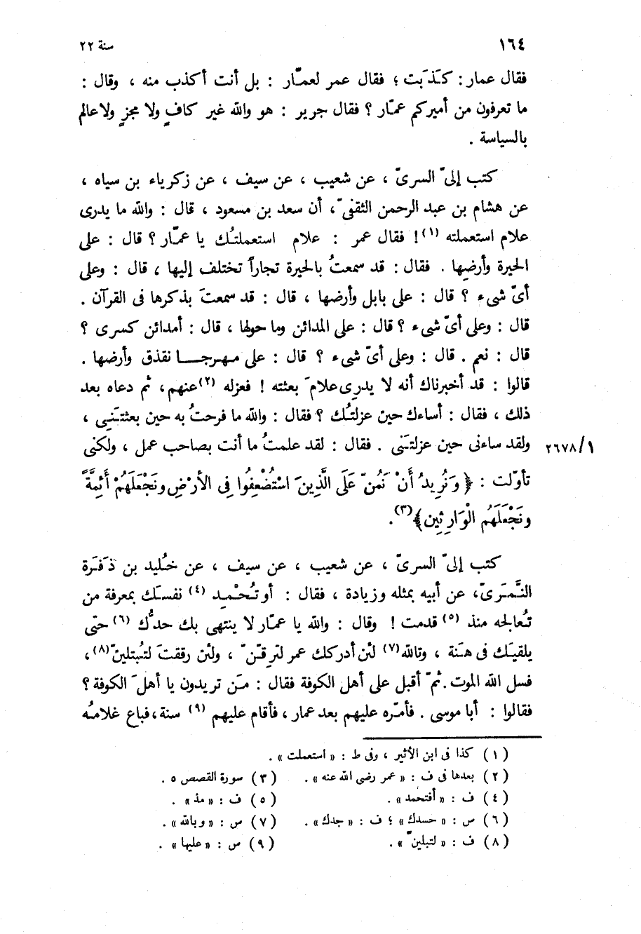 كَتَبَ إلي السري، عن شعيب، عن سيف، عن زَكَرِيَّاءَ بْنِ سِيَاهٍ، عَنْ هِشَامِ بْنِ عَبْدِ الرَّحْمَنِ الثَّقَفِيِّ، أَنَّ سَعْدَ بْنَ مَسْعُودٍ، قَالَ: والله ما يدرى علام استعملته! فَقَالَ عُمَرُ: عَلامَ اسْتَعْمَلْتُكَ يَا عَمَّارُ؟ قَالَ: على الحيرة وأرضها فقال: قد سمعت بِالْحِيرَةِ تُجَّارًا تَخْتَلِفُ إِلَيْهَا، قَالَ: وَعَلَى أَيِّ شَيْءٍ؟ قَالَ: عَلَى بَابِلَ وَأَرْضِهَا، قَالَ: قَدْ سَمِعْتُ بِذِكْرِهَا فِي الْقُرْآنِ.