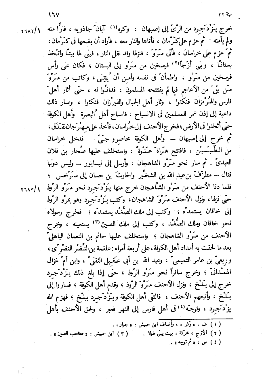 خرج يزدجرد من الري إلى إصبهان، وكره آبان جاذويه، فَارًّا مِنْهُ وَلَمْ يَأْمَنْهُ ثُمَّ عَزَمَ على كرمان، فأتاها والنار معه، فأراد أن يضعها في كرمان، ثم عزم على خراسان، فأتى مرو، فنزلها وقد نقل النار، فبنى لها بيتا واتخذ بستانا، وبنى أزجا فرسخين من مرو إلى البستان، فكان على رأس فرسخين من مرو، واطمأن في نفسه وأمن أن يؤتى، وكاتب من مرو من بقي من الأعاجم فيما لم يفتتحه المسلمون، فدانوا له، حتى أثار أهل فارس والهرمزان فنكثوا، وثار أهل الجبال والفيرزان فنكثوا، وصار ذلك داعية إلى إذن عمر للمسلمين في الانسياح، فانساح أهل البصرة وأهل الكوفة حتى أثخنوا في الأرض، فخرج الأحنف إلى خراسان، فاخذ على مهرجانقذق، ثم خرج إلى إصبهان- وأهل الكوفة محاصرو جي- فدخل خراسان من الطبسين، فافتتح هراة عنوة، واستخلف عليها صحار بْن فلان العبدي ثم سار نحو مرو الشاهجان، وأرسل إلى نيسابور- وليس دونها قتال- مطرف بْن عبد اللَّه بْن الشخير والحارث بْن حسان إلى سرخس، فلما دنا الأحنف من مرو الشاهجان خرج منها يزدجرد نحو مرو الروذ حتى نزلها، ونزل الأحنف مرو الشاهجان، وكتب يزدجرد وهو بمرو الروذ إلى خاقان يستمده، وكتب إلى ملك الصغد يستمده، فخرج رسولاه نحو خاقان وملك الصغد، وكتب إلى ملك الصين يستعينه، وخرج الأحنف من مرو الشاهجان، واستخلف عليها حاتم بْن النعمان الباهلي بعد ما لحقت به أمداد أهل الكوفة، على أربعة أمراء: علقمة بْن النضر النضري، وربعي بْن عامر التميمي، وعبد اللَّه بْن أبي عقيل الثقفي، وابن أم غزال الهمذاني، وخرج سائرا نحو مرو الروذ، حتى إذا بلغ ذلك يزدجرد خرج إلى بلخ، ونزل الأحنف مرو الروذ، وقدم أهل الكوفة، فساروا إلى بلخ، واتبعهم الأحنف، فالتقى أهل الكوفة ويزدجرد ببلخ، فهزم اللَّه يزدجرد، وتوجه في أهل فارس إلى النهر فعبر، ولحق الأحنف باهل
