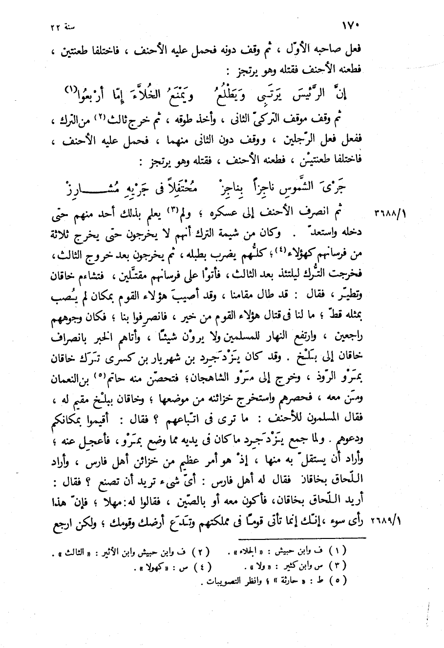 ثُمَّ وَقَفَ مَوْقِفَ التُّرْكِيِّ الثَّانِي، وَأَخَذَ طَوْقَهُ، ثُمَّ خَرَجَ ثَالِثٌ مِنَ التُّرْكِ، فَفَعَلَ فِعْلَ الرَّجُلَيْنِ، وَوَقَفَ دُونَ الثَّانِي مِنْهُمَا، فَحَمَلَ عَلَيْهِ الأَحْنَفُ، فَاخْتَلَفَا طَعْنَتَيْنِ، فَطَعَنَهُ الأَحْنَفُ، فَقَتَلَهُ وَهُوَ يَرْتَجِزُ: