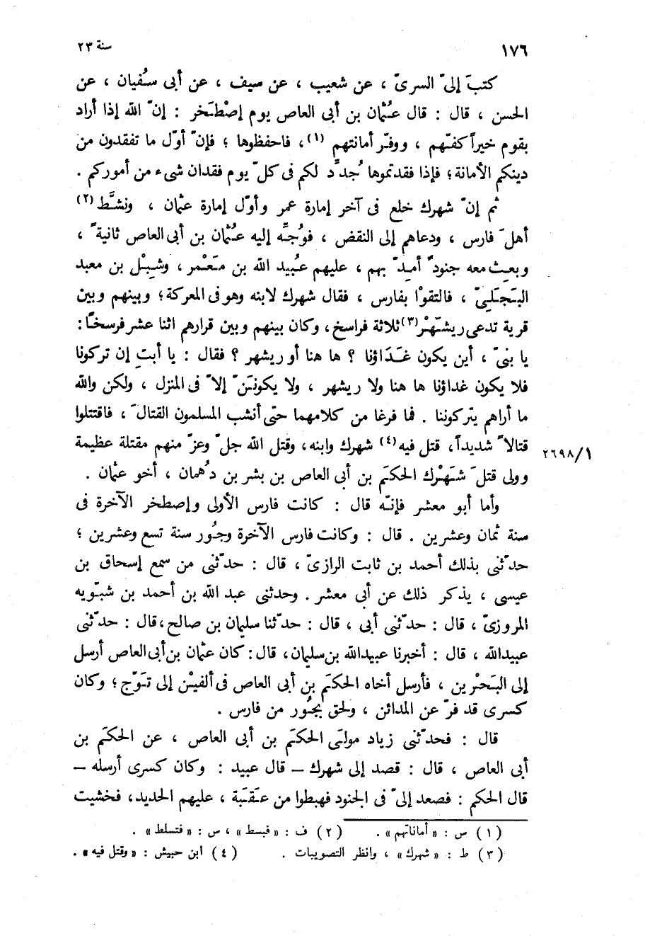 وَأَمَّا أَبُو مَعْشَرٍ فَإِنَّهُ قَالَ: كَانَتْ فَارِسُ الأُولَى وَإِصْطَخْرُ الآخِرَةَ فِي سَنَةِ ثَمَانٍ وَعِشْرِينَ قَالَ: وَكَانَتْ فَارِسُ الآخِرَةَ وَجُورُ سَنَةَ تِسْعٍ وَعِشْرِينَ، حَدَّثَنِي بذلك أحمد بْن ثابت الرازي، قال: حَدَّثَنِي من سمع إسحاق بْن عيسى، يذكر ذلك عن أبي معشر وحدثني عبد اللَّه بْن أحمد بْن شبويه المروزي، قال: حَدَّثَنِي أبي، قال: حدثنا سليمان بن صالح، قال: حدثني عبيد اللَّه، قَالَ: أَخْبَرَنَا عُبَيْدُ اللَّهِ بْنُ سُلَيْمَانَ، قَالَ: كان عثمان بْن أبي العاص أرسل إلى البحرين، فأرسل أخاه الحكم بْن أبي العاص في ألفين إلى توج، وكان كسرى قد فر عن المدائن، ولحق بجور من فارس.