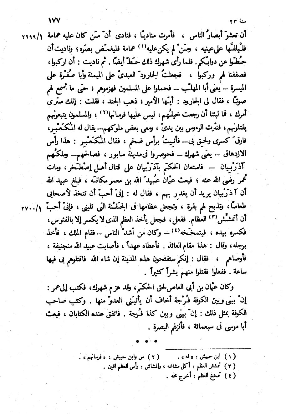 ان تعشوا أبصار الناس، فأمرت مناديا، فنادى أن من كان عليه عمامة فليلفها على عينيه، ومن لم يكن عليه عمامة فليغمض بصره، وناديت أن حطوا عن دوابكم فلما رأى شهرك ذلك حط أيضا ثم ناديت: أن اركبوا، فصففنا لهم وركبوا، فجعلت الجارود العبدي على الميمنة وأبا صفرة على الميسرة- يعني أبا المهلب- فحملوا على المسلمين فهزموهم، حتى ما أسمع لهم صوتا، فقال لي الجارود: أيها الأمير، ذهب الجند، فقلت: إنك سترى أمرك، فما لبثنا أن رجعت خيلهم، ليس عليها فرسانها، والمسلمون يتبعونهم يقتلونهم، فنثرت الرءوس بين يدي، ومعي بعض ملوكهم- يقال له المكعبر، فارق كسرى ولحق بي- فأتيت برأس ضخم، فقال المكعبر: هذا رأس الأزدهاق- يعني شهرك- فحوصروا في مدينة سابور، فصالحهم- وملكهم أذربيان- فاستعان الحكم بأذربيان على قتال أهل إصطخر، ومات عمر رضي اللَّه عنه، فبعث عثمان عبيد اللَّه بْن معمر مكانه، فبلغ عبيد اللَّه أن أذربيان يريد أن يغدر بهم، فقال له: إني أحب أن تتخذ لأصحابي طعاما، وتذبح لهم بقرة، وتجعل عظامها في الجفنة التي تليني، فإني أحب أن أتمشش العظام ففعل، فجعل يأخذ العظم الذي لا يكسر الا بالفئوس، فكسره بيده، فيتمخخه- وكان من أشد الناس- فقام الملك، فأخذ برجله، وقال: هذا مقام العائذ فأعطاه عهدا، فاصابت عبيد الله منجنيفه، فأوصاهم، فقال: إنكم ستفتحون هذه المدينة إن شاء اللَّه فاقتلوهم بي فيها ساعة ففعلوا فقتلوا منهم بشرا كثيرا.