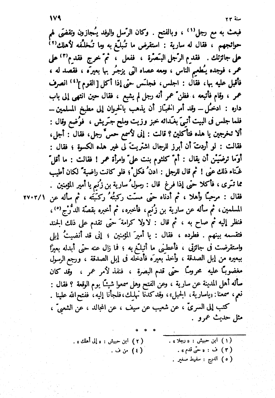 فَبَعَثَ بِهِ مَعَ رَجُلٍ، وَبِالْفَتْحِ وَكَانَ الرُّسُلُ وَالْوَفْدُ يُجَازُونَ وَتُقْضَى لَهُمْ حَوَائِجُهُمْ، فَقَالَ لَهُ سَارِيَةُ: اسْتَقْرِضْ مَا تَبْلُغُ بِهِ وَمَا تُخْلِفُهَ لأَهْلِكَ عَلَى جَائِزَتِكَ فَقَدِمَ الرَّجُلُ الْبَصْرَةَ، فَفَعَلَ، ثُمَّ خَرَجَ فَقَدِمَ عَلَى عُمَرَ، فَوَجَدَهُ يُطْعِمُ النَّاسَ، وَمَعَهُ عَصَاهُ الَّتِي يَزْجَرُ بِهَا بَعِيرَهُ، فَقَصَدَ لَهُ، فَأَقْبَلَ عَلَيْهِ بِهَا، فَقَالَ: اجْلِسْ، فَجَلَسَ حَتَّى إِذَا أَكَلَ الْقَوْمُ انْصَرَفَ عُمَرُ، وَقَامَ فَأَتْبَعَهُ، فَظَنَّ عُمَرُ أَنَّهُ رَجُلٌ لَمْ يَشْبَعْ، فَقَالَ حِينَ انْتَهَى إِلَى بَابِ دَارِهِ: ادْخُلْ- وَقَدْ أَمَرَ الْخَبَّازَ أَنْ يَذْهَبَ بِالْخُوَانِ إِلَى مَطْبَخِ الْمُسْلِمِينَ- فَلَمَّا جَلَسَ فِي الْبَيْتِ أُتِيَ بِغَدَائِهِ خُبْزٍ وَزَيْتٍ وَمِلْحِ جَرِيشٍ، فَوُضِعَ وَقَالَ: