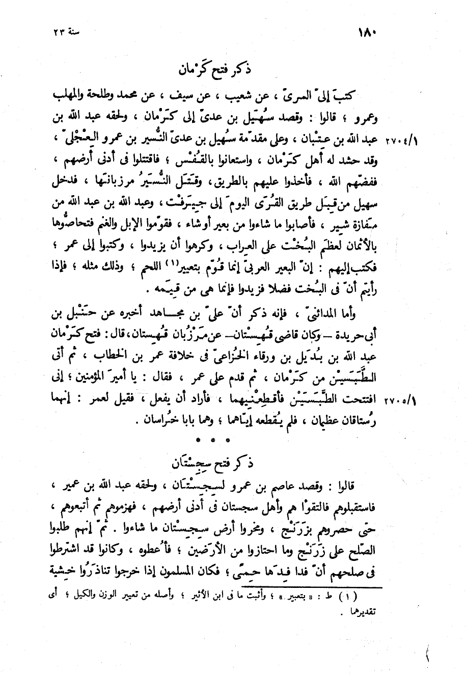 كَتَبَ إِلَيَّ السَّرِيُّ، عَنْ شعيب، عن سيف، عن محمد وطلحة والمهلب وعمرو، قالوا: وقصد سهيل بْن عدي إلى كرمان، ولحقه عبد اللَّه بْن عبد اللَّه بْن عتبان، وعلى مقدمة سهيل بْن عدي النسير بْن عمرو العجلي، وقد حشد له أهل كرمان، واستعانوا بالقفس، فاقتتلوا في أدنى أرضهم، ففضهم اللَّه، فأخذوا عليهم بالطريق، وقتل النسير مرزبانها، فدخل سهيل من قبل طريق القرى اليوم إلى جيرفت، وعبد اللَّه بْن عبد اللَّه من مفازة شير، فأصابوا ما شاءوا من بعير أو شاء، فقوموا الإبل والغنم فتحاصوها بالأثمان لعظم البخت على العراب، وكرهوا أن يزيدوا، وكتبوا إلى عمر، فكتب إليهم: إن البعير العربي إنما قوم بتعيير اللحم، وذلك مثله، فإذا رأيتم أن في البخت فضلا فزيدوا فإنما هي من قيمه.