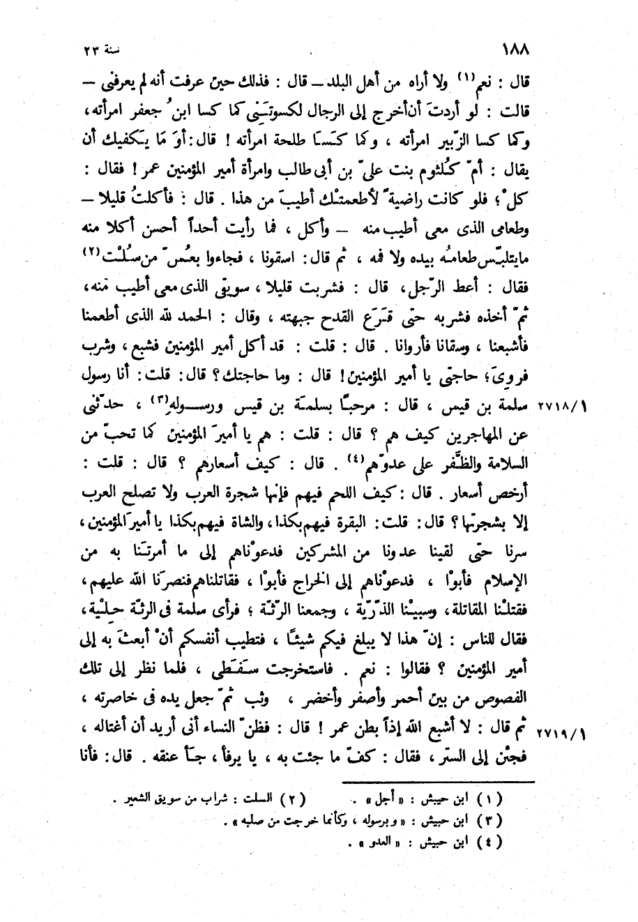 كُلْ، فَلَوْ كَانَتْ رَاضِيَةً لأَطْعَمَتْكَ أَطْيَبَ مِنْ هَذَا قَالَ: فَأَكَلْتُ قَلِيلا- وَطَعَامِي الَّذِي مَعِي أَطْيَبُ مِنْهُ- وَأَكَلَ، فَمَا رَأَيْتُ أَحَدًا أَحْسَنَ أَكْلا مِنْهُ مَا يَتَلَبَّسُ طَعَامُهُ بِيَدِهِ وَلا فَمِهِ، ثُمَّ قَالَ: اسْقُونَا، فَجَاءُوا بِعُسٍّ مِنْ سُلْتٍ فَقَالَ: أَعْطِ الرَّجُلَ، قَالَ: فَشَرِبْتُ قَلِيلا، سُوَيْقِي الَّذِي مَعِي أَطْيَبُ مِنْهُ، ثُمَّ أَخَذَهُ فَشَرِبَهُ حَتَّى قَرَعَ الْقَدَحُ جَبْهَتَهُ، وَقَالَ: الْحَمْدُ لِلَّهِ الَّذِي أَطْعَمَنَا فَأَشْبَعَنَا، وَسَقَانَا فَأَرْوَانَا قَالَ: قُلْتُ: قَدْ أَكَلَ أَمِيرُ الْمُؤْمِنِينَ فَشَبِعَ، وشرب فروى، حَاجَتِي يَا أَمِيرَ الْمُؤْمِنِينَ! قَالَ: وَمَا حَاجَتُكَ؟ قَالَ: قُلْتُ: أَنَا رَسُولُ سَلَمَةَ بْنِ قَيْسٍ، قَالَ: مَرْحَبًا بِسَلَمَةَ بْنِ قَيْسٍ وَرَسُولِهِ، حَدِّثْنِي عَنِ الْمُهَاجِرِينَ كَيْفَ هُمْ؟ قَالَ: قُلْتُ: هُمْ يَا أَمِيرَ الْمُؤْمِنِينَ كَمَا تُحِبُّ مِنَ السَّلامَةِ وَالظَّفَرِ عَلَى عَدُوِّهِمْ قَالَ: كَيْفَ أَسْعَارُهُمْ؟ قَالَ: قُلْتُ: