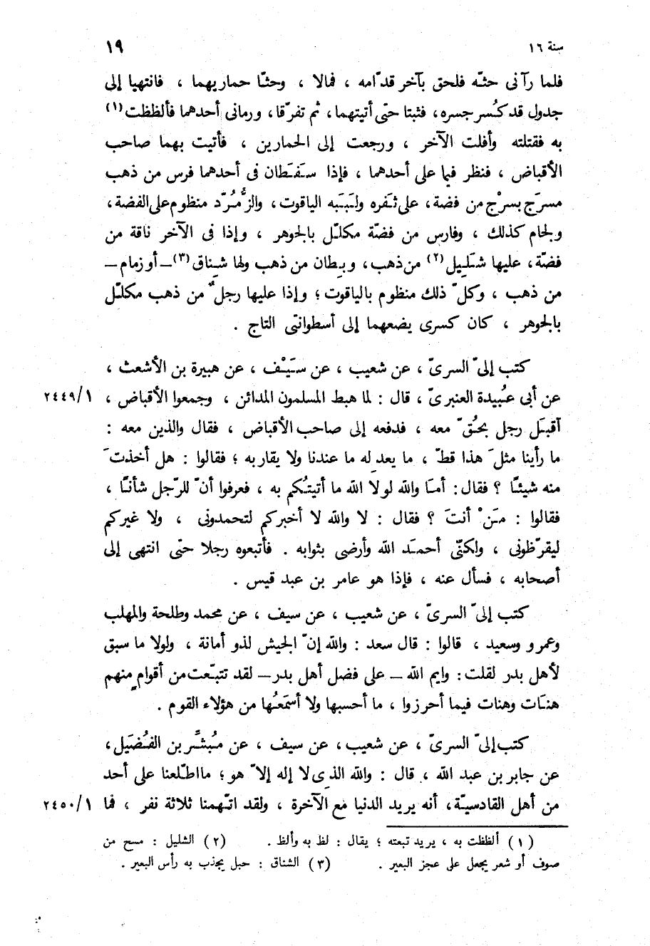 كَتَبَ إِلَيَّ السَّرِيُّ، عَنْ شُعَيْبٍ، عن سيف، عَنْ مُحَمَّدٍ وَطَلْحَةَ وَالْمُهَلَّبِ وَعَمْرٍو وَسَعِيدٍ، قَالُوا: قَالَ سَعْدٌ: وَاللَّهِ إِنَّ الْجَيْشَ لَذُو أَمَانَةٍ، وَلَوْلا مَا سَبَقَ لأَهْلِ بَدْرٍ لَقُلْتُ: وَايْمُ اللَّهِ- عَلَى فَضْلِ أَهْلِ بَدْرٍ- لَقَدْ تَتَبَّعْتُ مِنْ أَقْوَامِ مِنْهُمْ هَنَات وَهَنَات فِيمَا أَحْرَزُوا، مَا أَحْسَبُهَا وَلا أَسْمَعُهَا مِنْ هَؤُلاءِ الْقَوْمِ.