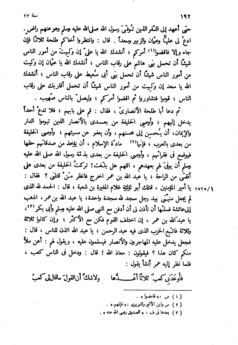حتى اعهد الى النفر الذين توفى رسول الله ص وَهُوَ عَنْهُمْ رَاضٍ ادْعُ لِي عَلِيًّا وَعُثْمَانَ وَالزُّبَيْرَ وَسَعْدًا قَالَ: وَانْتَظِرُوا أَخَاكُمْ طَلْحَةَ ثَلاثًا فَإِنْ جَاءَ وَإِلا فَاقْضُوا أَمْرَكُمْ، أَنْشُدُكَ اللَّهَ يَا عَلِيُّ إِنْ وَلِيتَ مِنْ أُمُورِ النَّاسِ شَيْئًا أَنْ تَحْمِلَ بَنِي هَاشِمٍ عَلَى رِقَابِ النَّاسِ، أَنْشُدُكَ اللَّهَ يَا عُثْمَانُ إِنْ وَلِيتَ مِنْ أُمُورِ النَّاسِ شَيْئًا أَنْ تَحْمِلَ بَنِي أَبِي مُعَيْطٍ عَلَى رِقَابِ النَّاسِ، أَنْشُدُكَ اللَّهَ يَا سَعْدُ إِنْ وَلِيتَ مِنْ أُمُورِ النَّاسِ شَيْئًا أَنْ تَحْمِلَ أَقَارِبَكَ عَلَى رِقَابِ النَّاسِ، قُومُوا فَتَشَاوَرُوا ثُمَّ اقْضُوا أَمْرَكُمْ، وَلْيُصَلِّ بِالنَّاسِ صُهَيْبٌ ثُمَّ دَعَا أَبَا طَلْحَةَ الأَنْصَارِيَّ، فَقَالَ: قُمْ عَلَى بَابِهِمْ، فَلا تَدَعْ أَحَدًا يَدْخُلُ إِلَيْهِمْ، وَأُوصِي الْخَلِيفَةَ مِنْ بَعْدِي بِالأَنْصَارِ الَّذِينَ تَبَوَّءُوا الدَّارَ وَالإِيمَانَ، أَنْ يُحْسِنَ إِلَى مُحْسِنِهِمْ، وَأَنْ يَعْفُوَ عَنْ مُسِيئِهِمْ، وَأُوصِي الْخَلِيفَةَ مِنْ بَعْدِي بِالْعَرَبِ، فَإِنَّهَا مَادَّةُ الإِسْلامِ، أَنْ يُؤْخَذَ من صدقاتهم حقها فيوضع فِي فُقَرَائِهِمْ، وَأُوصِي الْخَلِيفَةَ مِنْ بَعْدِي بِذِمَّةِ رسول الله ص أَنْ يُوَفِّيَ لَهُمْ بِعَهْدِهِمْ، اللَّهُمَّ هَلْ بَلَّغْتُ! تَرَكْتُ الْخَلِيفَةَ مِنْ بَعْدِي عَلَى أَنْقَى مِنَ الرَّاحَةِ، يَا عَبْدَ اللَّهِ بْنَ عُمَرَ اخْرُجْ فَانْظُرْ مَنْ قَتَلَنِي؟ فَقَالَ: