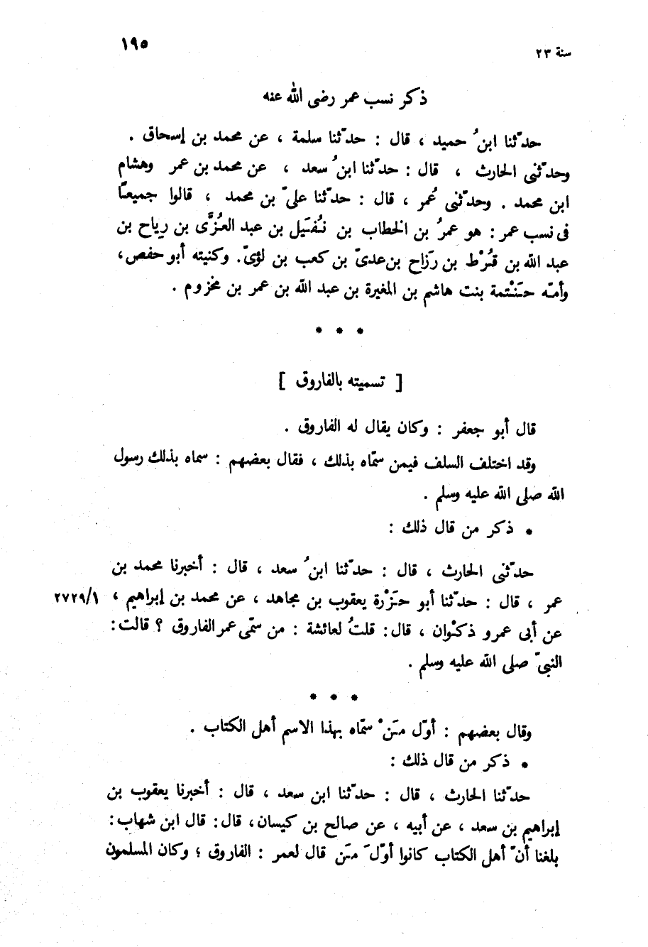 وحدثني الحارث، قَالَ: حَدَّثَنَا ابن سعد، عن محمد بن عمر وهشام ابن مُحَمَّد وحدثني عمر، قال: حَدَّثَنَا علي بْن مُحَمَّد، قالوا جميعا في نسب عمر: هو عمر بْن الْخَطَّاب بْن نفيل بْن عبد العزى بْن رياح بْن عبد اللَّه بْن قرط بْن رزاح بْن عدي بْن كعب بْن لؤي وكنيته أبو حفص، وأمه حنتمة بنت هاشم بْن المغيرة بْن عبد اللَّه بْن عمر بن مخزوم