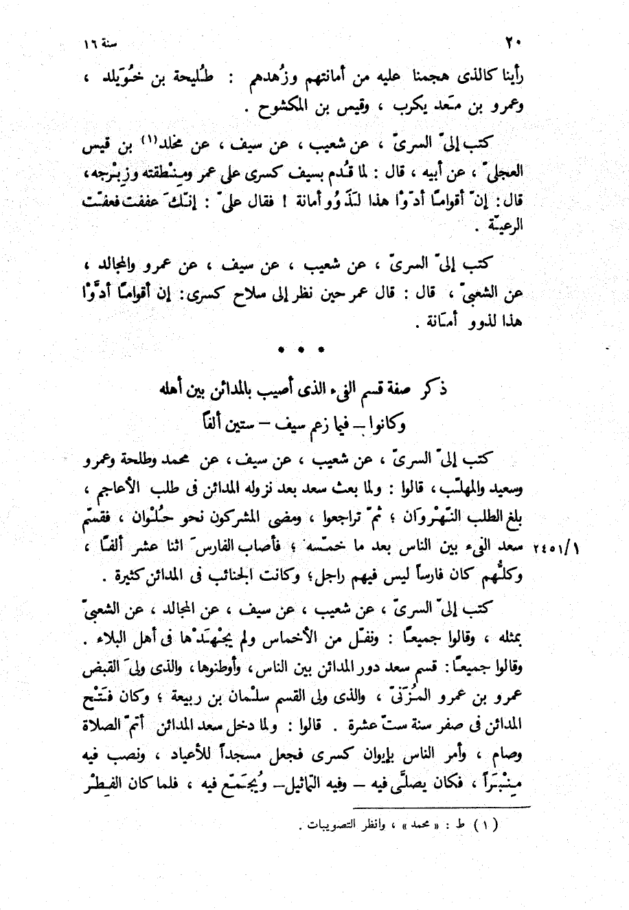 كَتَبَ إِلَيَّ السَّرِيُّ، عَنْ شعيب، عن سيف، عن محمد وطلحة وعمرو وَسَعِيدٍ وَالْمُهَلَّبِ، قَالُوا: وَلَمَّا بَعَثَ سَعْدٌ بَعْدَ نُزُولِهِ الْمَدَائِنَ فِي طَلَبِ الأَعَاجِمِ، بَلَغَ الطَّلَبُ النَّهْرَوَانَ، ثُمَّ تَرَاجَعُوا، وَمَضَى الْمُشْرِكُونَ نَحْوَ حُلْوَانَ، فَقَسَّمَ سَعْدٌ الْفَيْءَ بَيْنَ النَّاسِ بَعْدَ مَا خَمَسَهُ، فَأَصَابَ الْفَارِسَ اثْنَا عَشَرَ أَلْفًا، وَكُلُّهُمْ كَانَ فَارِسًا لَيْسَ فِيهِمْ رَاجِلٌ، وَكَانَتِ الْجَنَائِبُ فِي الْمَدَائِنِ كَثِيرَةً.