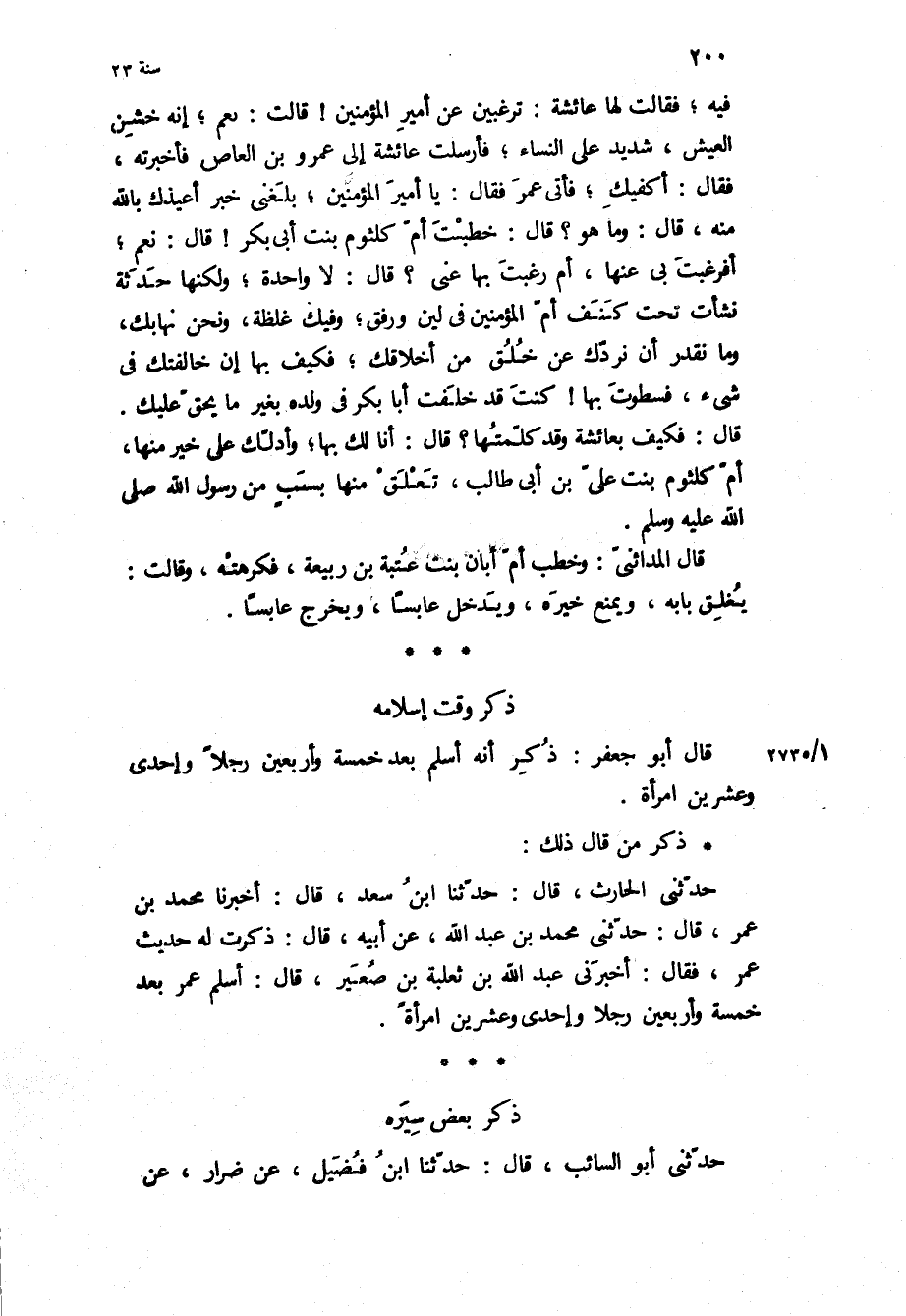حدثني الحارث، قَالَ: حدثنا ابن سعد، قال: أخبرنا محمد بن عُمَرَ، قَالَ: حَدَّثَنِي مُحَمَّدُ بْنُ عَبْدِ اللَّهِ، عَنْ أَبِيهِ، قَالَ: ذَكَرْتُ لَهُ حَدِيثَ عُمَرَ، فَقَالَ: أَخْبَرَنِي عَبْدُ اللَّهِ بْنُ ثَعْلَبَةَ بْنِ صُعَيْرٍ، قَالَ: أَسْلَمَ عُمَرُ بَعْدَ خَمْسَةٍ وَأَرْبَعِينَ رَجُلا وَإِحْدَى وَعِشْرِينَ امْرَأَةً