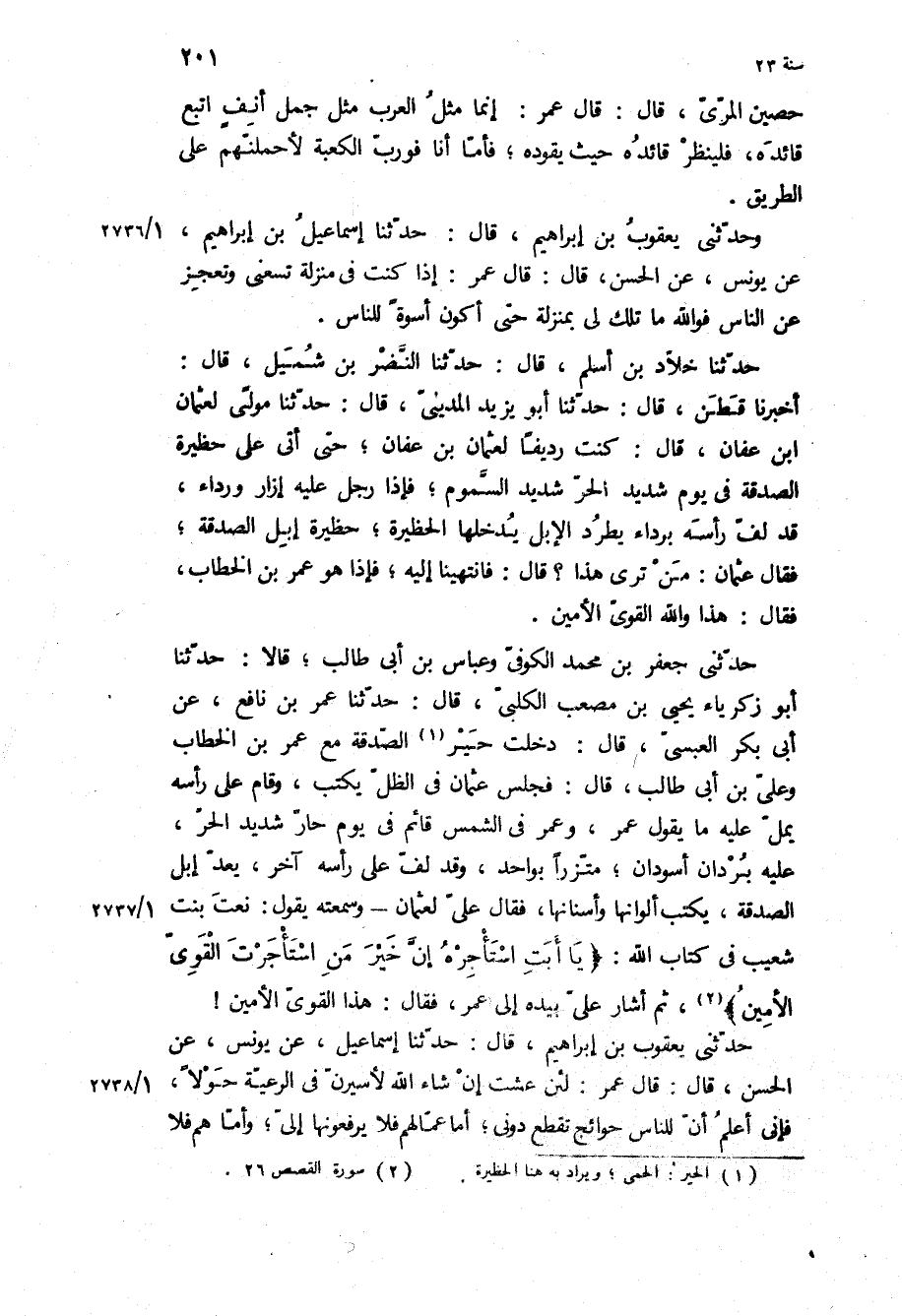 حَدَّثَنِي جَعْفَرُ بْنُ مُحَمَّدٍ الْكُوفِيُّ وَعَبَّاسُ بْنُ أَبِي طَالِبٍ، قَالا: حَدَّثَنَا أَبُو زَكَرِيَّاءَ يَحْيَى بْنُ مُصْعَبٍ الْكَلْبِيُّ، قَالَ: حَدَّثَنَا عُمَرُ بْنُ نَافِعٍ، عَنْ أَبِي بَكْرٍ الْعَبْسِيِّ، قَالَ: دَخَلْتُ حَيْرَ الصَّدَقَةِ مَعَ عُمَرَ بْنَ الْخَطَّابِ وَعَلِيَّ بْنَ أَبِي طَالِبٍ، قَالَ: فَجَلَسَ عُثْمَانُ فِي الظِّلِّ يَكْتُبُ، وَقَامَ عَلِيٌّ راسه يمل عَلَيْهِ مَا يَقُولُ عُمَرُ، وَعُمَرُ فِي الشَّمْسِ قَائِمٌ فِي يَوْمٍ حَارٍّ شَدِيدِ الْحَرِّ، عَلَيْهِ بُرْدَانِ أَسْوَدَانِ، مُتَّزِرًا بِوَاحِدٍ، وَقَدْ لَفَّ عَلَى رَأْسِهِ آخَرَ، يَعُدُّ إِبِلَ الصَّدَقَةِ، يَكْتُبُ أَلْوَانَهَا وَأَسْنَانَهَا، فَقَالَ عَلِيٌّ لِعُثْمَانَ- وَسَمِعْتُهُ يَقُولُ: نَعْتَ بِنْتِ شُعَيْبٍ فِي كِتَابِ اللَّهِ: يَا أَبَتِ اسْتَأْجِرْهُ إِنَّ خَيْرَ مَنِ اسْتَأْجَرْتَ الْقَوِيُّ الْأَمِينُ، ثُمَّ أَشَارَ عَلِيٌّ بِيَدِهِ إِلَى عُمَرَ، فَقَالَ: [هَذَا الْقَوِيُّ الأَمِينُ!] حَدَّثَنِي يَعْقُوبُ بْنُ إِبْرَاهِيمَ، قَالَ: حَدَّثَنَا إِسْمَاعِيلُ، عَنْ يُونُسَ، عَنِ الْحَسَنِ، قَالَ: قَالَ عُمَرُ: لَئِنْ عِشْتُ إِنْ شَاءَ اللَّهُ لأَسِيرَنَّ فِي الرَّعِيَّةِ حَوْلا، فَإِنِّي أَعْلَمُ أَنَّ لِلنَّاسِ حَوَائِجَ تُقْطَعُ دُونِي، أَمَّا عُمَّالُهُمْ فَلا يَرْفَعُونَهَا إِلَيَّ، وَأَمَّا هُمْ فَلا