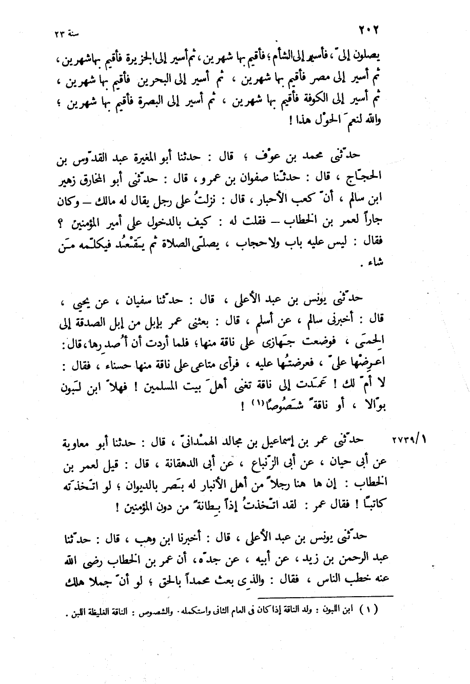 يَصِلُونَ إِلَيَّ، فَأَسِيرُ إِلَى الشَّامِ، فَأُقِيمُ بِهَا شَهْرَيْنِ، ثُمَّ أَسِيرُ إِلَى الْجَزِيرَةِ فَأُقِيمُ بِهَا شَهْرَيْنِ، ثُمَّ أَسِيرُ إِلَى مِصْرَ فَأُقِيمُ بِهَا شَهْرَيْنِ، ثُمَّ أَسِيرُ إِلَى الْبَحْرَيْنِ فَأُقِيمُ بِهَا شَهْرَيْنِ، ثُمَّ أَسِيرُ إِلَى الْكُوفَةِ فَأُقِيمُ بِهَا شَهْرَيْنِ، ثُمَّ أَسِيرُ إِلَى الْبَصْرَةِ فَأُقِيمُ بِهَا شَهْرَيْنِ، وَاللَّهِ لَنِعْمَ الْحَوْلُ هَذَا! حَدَّثَنِي مُحَمَّدُ بْنُ عَوْفٍ، قَالَ: حَدَّثَنَا أَبُو المغيرة عبد القدوس بْن الحجاج، قال: حَدَّثَنَا صفوان بْن عمرو، قال: حدثنى ابو المخارق زهير ابن سالم، أن كعب الأحبار، قال: نزلت على رجل يقال له مالك- وكان جارا لعمر بْن الخطاب- فقلت له: كيف بالدخول على أمير المؤمنين؟