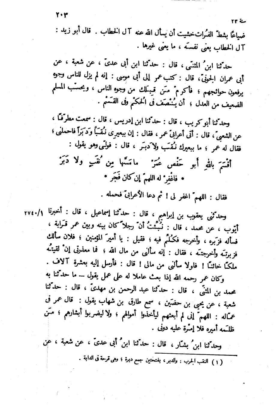 حَدَّثَنَا ابْنُ الْمُثَنَّى، قَالَ: حَدَّثَنَا ابْنُ أَبِي عدي، عن شعبة، عن أبي عمران الجوني، قال: كتب عمر إلى أبي موسى: إنه لم يزل للناس وجوه يرفعون حوائجهم، فأكرم من قبلك من وجوه الناس، وبحسب المسلم الضعيف من العدل، أن ينصف في الحكم وفي القسم.