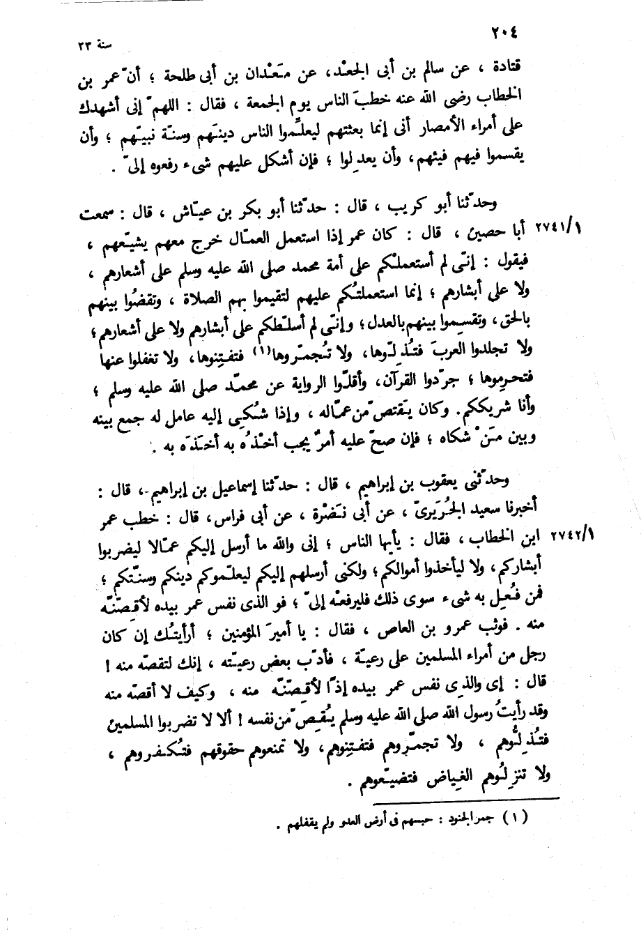 أَخْبَرَنَا سَعِيدٌ الْجُرَيْرِيُّ، عَنْ أَبِي نَضْرَةَ، عَنْ أَبِي فِرَاسٍ، قَالَ: خَطَبَ عمر ابن الخطاب، فقال: يا ايها النَّاسُ، إِنِّي وَاللَّهِ مَا أُرْسِلُ إِلَيْكُمْ عُمَّالا لِيَضْرِبُوا أَبْشَارَكُمْ، وَلا لِيَأْخُذُوا أَمْوَالَكُمْ، وَلَكِنِّي أُرْسِلُهُمْ إِلَيْكُمْ لِيُعَلِّمُوكُمْ دِينَكُمْ وَسُنَّتَكُمْ، فَمَنْ فُعِلَ بِهِ شيء سوى ذلك فليرفعه الى، فو الذى نَفْسُ عُمَرَ بِيَدِهِ لأُقِصَّنَّهُ مِنْهُ فَوَثَبَ عَمْرُو بْنُ الْعَاصِ، فَقَالَ: يَا أَمِيرَ الْمُؤْمِنِينَ، أَرَأَيْتُكَ إِنْ كَانَ رَجُلٌ مِنْ أُمَرَاءِ الْمُسْلِمِينَ عَلَى رَعِيَّةٍ، فَأَدَّبَ بَعْضَ رَعِيَّتِهِ، إِنَّكَ لَتُقِصَّهُ مِنْهُ! قَالَ: إِي وَالَّذِي نَفْسُ عُمَرَ بِيَدِهِ إِذًا لأُقِصَّنَّهُ مِنْهُ، وَكَيْفَ لا أُقِصَّهُ مِنْهُ وَقَدْ رايت رسول الله ص يُقِصُّ مِنْ نَفْسِهِ! أَلا لا تَضْرِبُوا الْمُسْلِمِينَ فَتُذِلُّوهُمْ، وَلا تَجْمُرُوهُمْ فَتَفْتِنُوهُمْ، وَلا تَمْنَعُوهُمْ حُقُوقَهُمْ فتكفروهم، وَلا تَنْزِلُوهُمُ الْغِيَاضَ فَتُضَيِّعُوهُمْ