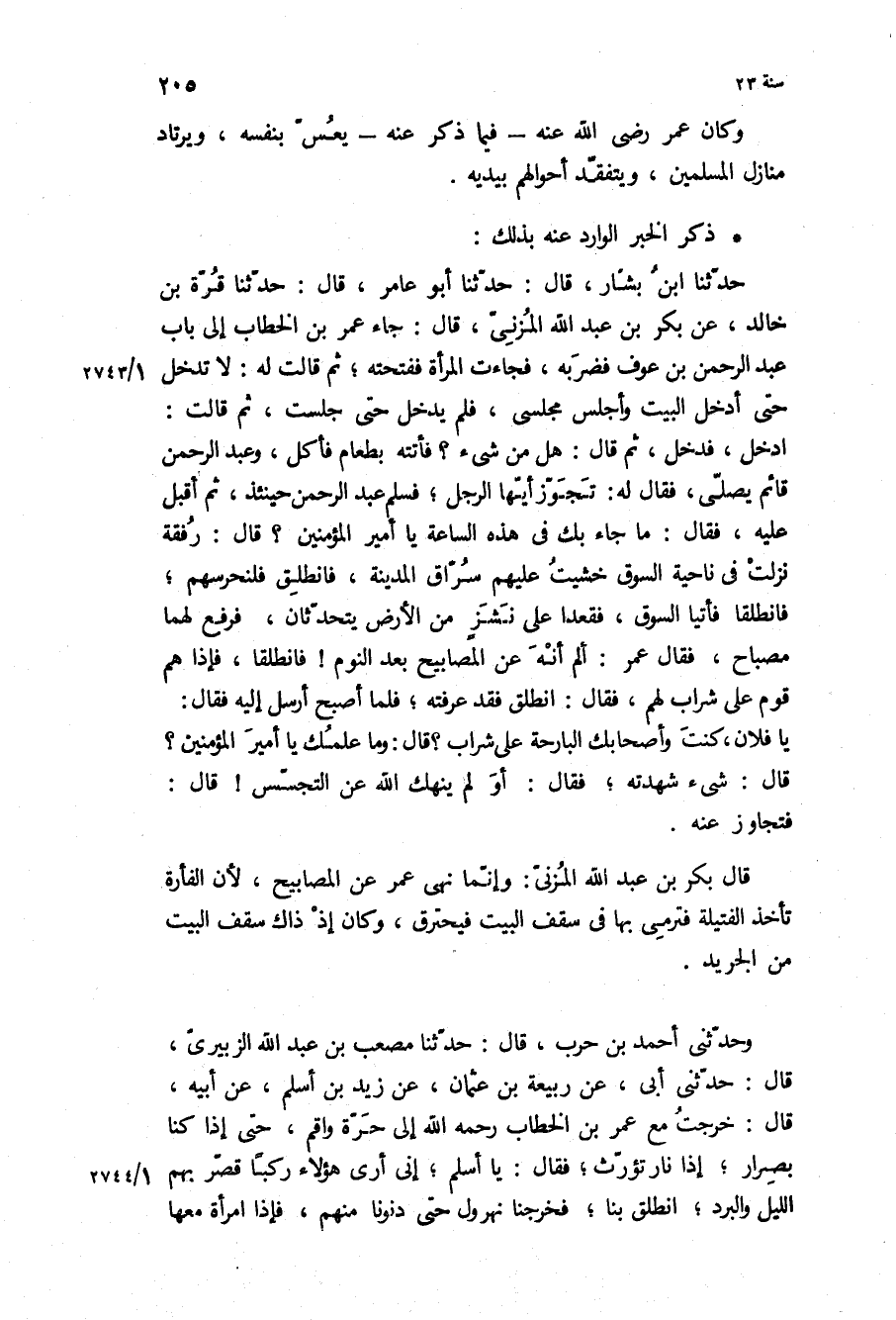 ادْخُلْ، فَدَخَلَ، ثُمَّ قَالَ: هَلْ مِنْ شَيْءٍ؟ فَأَتَتْهُ بِطَعَامٍ فَأَكَلَ، وَعَبْدُ الرَّحْمَنِ قَائِمٌ يُصَلِّي، فَقَالَ لَهُ: تَجَوَّزْ أَيُّهَا الرَّجُلُ، فَسَلَّمَ عَبْدُ الرَّحْمَنِ حِينَئِذٍ، ثُمَّ أَقْبَلَ عَلَيْهِ، فَقَالَ: مَا جَاءَ بِكَ فِي هَذِهِ السَّاعَةِ يَا أَمِيرَ الْمُؤْمِنِينَ؟ قَالَ: رُفْقَةٌ نَزَلَتْ فِي نَاحِيَةِ السُّوقِ خَشِيتُ عَلَيْهِمْ سُرَّاقَ الْمَدِينَةِ، فَانْطَلِقْ فَلْنَحْرُسْهُمْ، فَانْطَلَقَا فَأَتَيَا السُّوقَ، فَقَعَدَا عَلَى نَشَزٍ مِنَ الأَرْضِ يَتَحَدَّثَانِ، فَرُفِعَ لَهُمَا مِصْبَاحٌ، فَقَالَ عُمَرُ: أَلَمْ أَنْهَ عَنِ الْمَصَابِيحِ بَعْدَ النَّوْمِ! فَانْطَلَقَا، فَإِذَا هُمْ قَوْمٌ عَلَى شَرَابٍ لَهُمْ، فَقَالَ: انْطَلِقْ فَقَدْ عَرَفْتُهُ، فَلَمَّا أَصْبَحَ أَرْسَلَ إِلَيْهِ فَقَالَ: