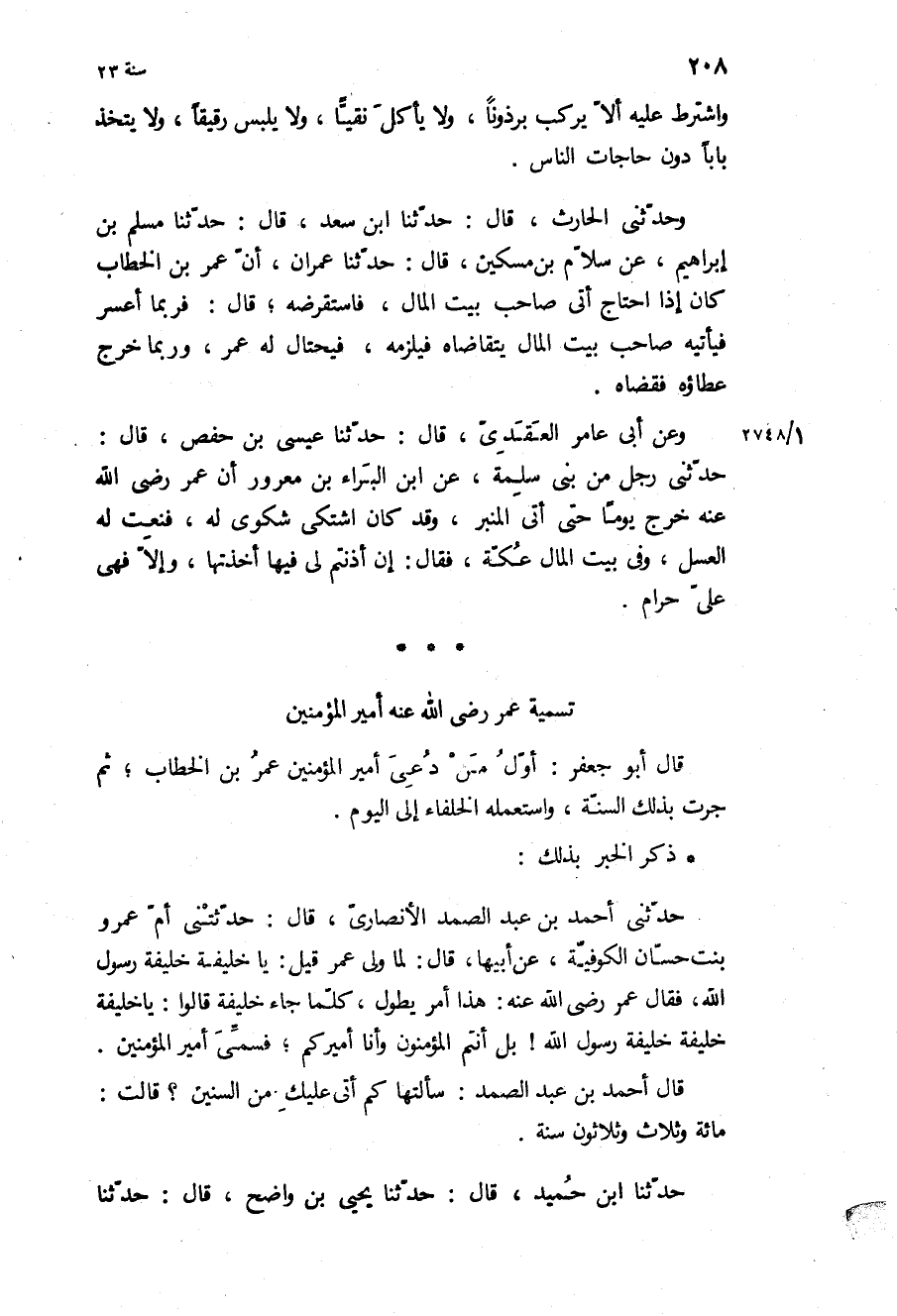 حَدَّثَنِي أَحْمَدُ بْنُ عبد الصمد الأنصاري، قال: حدثنى أُمُّ عَمْرٍو بِنْتُ حَسَّانٍ الْكُوفِيَّةُ، عَنْ أَبِيهَا، قَالَ: لَمَّا وَلِيَ عُمَرُ قِيلَ: يَا خَلِيفَةَ خليفه رسول الله، فَقَالَ عُمَرُ رَضِيَ اللَّهُ عَنْهُ: هَذَا أَمْرٌ يَطُولُ، كُلَّمَا جَاءَ خَلِيفَةٌ قَالُوا: يَا خَلِيفَةَ خليفه خليفه رسول الله! بَلْ أَنْتُمُ الْمُؤْمِنُونَ وَأَنَا أَمِيرُكُمْ، فَسُمِّيَ أَمِيرَ الْمُؤْمِنِينَ.