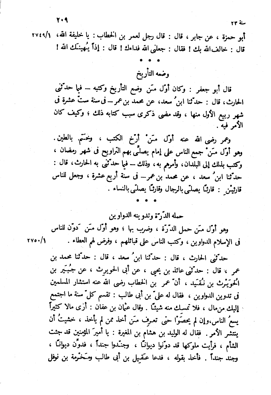 حَدَّثَنِي الْحَارِثُ، قَالَ: حدثنا ابن سعد، قال: حدثنا محمد بن عُمَرَ، قَالَ: حَدَّثَنِي عَائِذُ بْنُ يَحْيَى، عَنْ أَبِي الْحُوَيْرِثِ، عَنْ جُبَيْرِ بْنِ الْحُوَيْرِثِ بْنِ نُقَيْدٍ، أَنَّ عُمَرَ بْنَ الْخَطَّابِ رَضِيَ اللَّهُ عَنْهُ اسْتَشَارَ الْمُسْلِمِينَ فِي تَدْوِينِ الدَّوَاوِينِ، فَقَالَ لَهُ عَلِيُّ بْنُ أَبِي طَالِبٍ: تَقْسِمُ كُلَّ سَنَةٍ مَا اجْتَمَعَ إِلَيْكَ مِنْ مَالٍ، فَلا تُمْسِكْ مِنْهُ شَيْئًا وَقَالَ عُثْمَانُ بْنُ عَفَّانَ: أَرَى مَالا كَثِيرًا يَسَعُ النَّاسَ، وَإِنْ لَمْ يُحْصَوْا حَتَّى تَعْرِفَ مَنْ أَخَذَ مِمَّنْ لَمْ يَأْخُذْ، خَشِيتُ أَنْ يَنْتَشِرَ الأَمْرُ فَقَالَ لَهُ الْوَلِيدُ بْنُ هِشَامِ بْنِ الْمُغِيرَةِ: يَا أَمِيرَ الْمُؤْمِنِينَ قَدْ جِئْتُ الشَّامَ، فَرَأَيْتُ مُلُوكَهَا قَدْ دَوَّنُوا دِيوَانًا، وَجَنَّدُوا جُنْدًا، فَدَوِّنْ دِيوَانًا، وَجَنِّدْ جُنْدًا فَأَخَذَ بِقَوْلِهِ، فَدَعَا عَقِيلَ بْنَ أَبِي طَالِبٍ وَمَخْرَمَةَ بْنَ نَوْفَلٍ