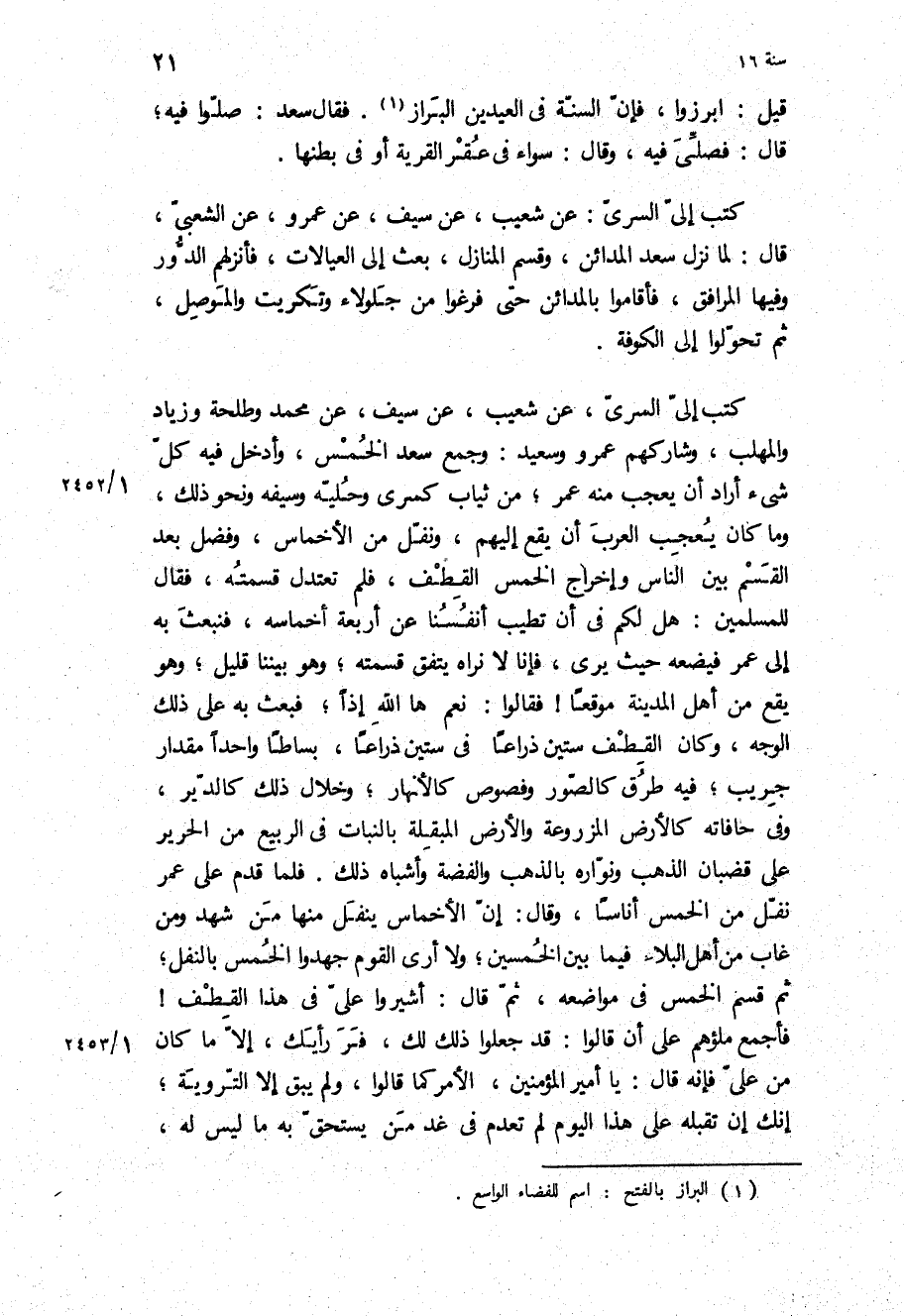 كَتَبَ إِلَيَّ السَّرِيُّ: عَنْ شُعَيْبٍ، عَنْ سَيْفٍ، عَنْ عَمْرٍو، عَنِ الشَّعْبِيِّ، قَالَ: لَمَّا نَزَلَ سَعْدٌ الْمَدَائِنَ، وَقَسَّمَ الْمَنَازِلَ، بَعَثَ إِلَى الْعِيَالاتِ، فَأَنْزَلَهُمُ الدُّورَ وَفِيهَا الْمَرَافِقُ، فَأَقَامُوا بِالْمَدَائِنِ حَتَّى فَرَغُوا مِنْ جَلُولاءَ وَتِكْرِيتَ وَالْمَوْصِلِ، ثُمَّ تَحَوَّلُوا إِلَى الْكُوفَةِ كَتَبَ إِلَيَّ السَّرِيُّ، عَنْ شُعَيْبٍ، عَنْ سيف، عن محمد وطلحة وزياد وَالْمُهَلَّبِ، وَشَارَكَهُمْ عَمْرٌو وَسَعِيدٌ: وَجَمَعَ سَعْدٌ الْخُمُسَ، وَأَدْخَلَ فِيهِ كُلَّ شَيْءٍ أَرَادَ أَنْ يَعْجَبَ مِنْهُ عُمَرُ، مِنْ ثِيَابِ كِسْرَى وَحُلِيِّهِ وَسَيْفِهِ وَنَحْوِ ذَلِكَ، وَمَا كَانَ يُعْجِبُ الْعَرَبُ أَنْ يَقَعَ إِلَيْهِمْ، وَنَفَلَ مِنَ الأَخْمَاسِ، وَفَضَلَ بَعْدَ الْقَسْمِ بَيْنَ النَّاسِ وَإِخْرَاجِ الْخُمُسِ الْقِطْفُ، فَلَمْ تَعْتَدِلْ قِسْمَتُهُ، فَقَالَ لِلْمُسْلِمِينَ: هَلْ لَكُمْ فِي أَنْ تَطِيبَ أَنْفُسُنَا عَنْ أَرْبَعَةِ أَخْمَاسِهِ، فَنَبْعَثُ بِهِ إِلَى عُمَرَ فَيَضَعَهُ حَيْثُ يَرَى، فَإِنَّا لا نَرَاهُ يَتَّفِقُ قِسْمَتَهُ، وَهُوَ بَيْنَنَا قَلِيلٌ، وَهُوَ يَقَعُ مِنْ أَهْلِ الْمَدِينَةِ مَوْقِعًا! فَقَالُوا: نَعَمْ هَا اللَّهِ إِذًا، فَبَعَثَ بِهِ عَلَى ذَلِكَ الْوَجْهِ، وَكَانَ الْقِطْفُ سِتِّينَ ذِرَاعًا فِي سِتِّينَ ذِرَاعًا، بُسَاطًا وَاحِدًا مِقْدَارُ جَرِيبٍ، فِيهِ طُرُقٌ كَالصُّوَرِ وَفُصُوصٌ كَالأَنْهَارِ، وَخِلالَ ذَلِكَ كَالدَّيْرِ، وَفِي حَافَاتِهِ كَالأَرْضِ الْمَزْرُوعَةِ وَالأَرْضِ الْمَبْقَلَةِ بِالنَّبَاتِ فِي الرَّبِيعِ مِنَ الْحَرِيرِ عَلَى قُضْبَانِ الذَّهَبِ وَنُوَّارُهُ بِالذَّهَبِ وَالْفِضَّةِ وَأَشْبَاهِ ذَلِكَ فَلَمَّا قَدِمَ عَلَى عُمَرَ نَفَلَ مِنَ الْخُمُسِ أُنَاسًا، وَقَالَ: إِنَّ الأَخْمَاسَ يُنْفَلُ مِنْهَا مَنْ شَهِدَ وَمَنْ غَابَ مِنْ أَهْلِ الْبَلاءِ فِيمَا بَيْنَ الْخُمُسَيْنِ، وَلا أَرَى الْقَوْمَ جَهَدُوا الْخُمُسَ بِالنَّفْلِ، ثُمَّ قَسَّمَ الْخُمُسَ فِي مَوَاضِعِهِ، ثُمَّ قَالَ: أَشِيرُوا عَلَيَّ فِي هَذَا الْقِطْفِ! فَأَجْمَعَ مَلَؤُهُمْ عَلَى أَنْ قَالُوا: قَدْ جَعَلُوا ذَلِكَ لَكَ، فَرِ رَأْيَكَ، إِلا مَا كَانَ مِنْ عَلِيٍّ فَإِنَّهُ [قَالَ: يَا أَمِيرَ الْمُؤْمِنِينَ، الأَمْرُ كَمَا قَالُوا، وَلَمْ يَبْقَ إِلا التَّرْوِيَةُ، إِنَّكَ إِنْ تَقْبَلْهُ عَلَى هَذَا الْيَوْمَ لَمْ تَعْدِمْ فِي غَدٍ مَنْ يَسْتَحِقُّ بِهِ مَا لَيْسَ لَهُ] ،