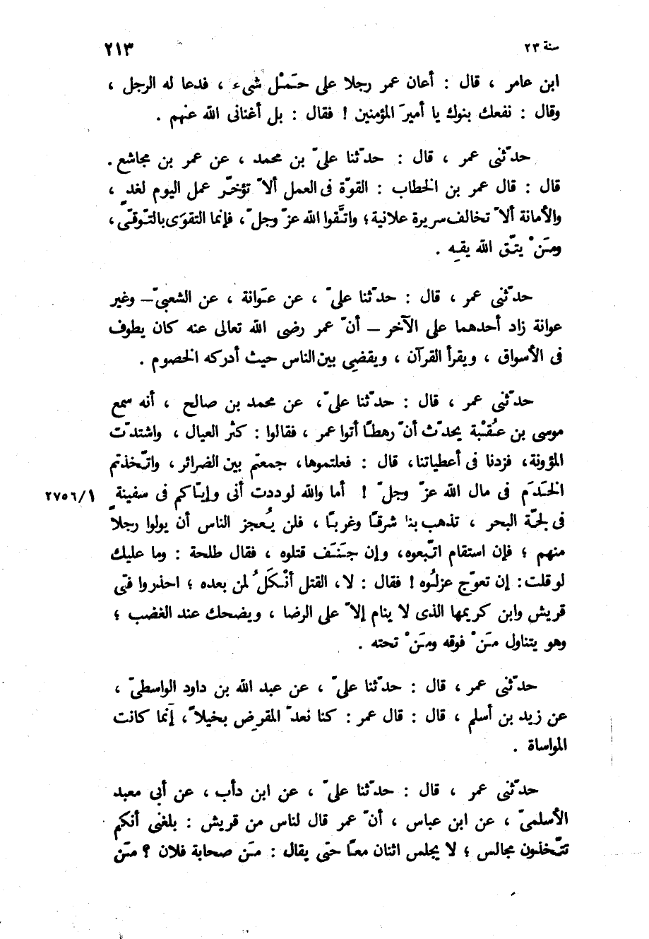 حَدَّثَنِي عُمَرُ، قَالَ: حَدَّثَنَا عَلِيٌّ، عَنْ مُحَمَّدِ بْنِ صَالِحٍ، أَنَّهُ سَمِعَ مُوسَى بْنَ عُقْبَةَ يُحَدِّثُ أَنَّ رَهْطًا أَتَوْا عُمَرَ، فَقَالُوا: كَثُرَ الْعِيَالُ، وَاشْتَدَّتِ الْمَئُونَةُ، فَزِدْنَا فِي أَعْطِيَاتِنَا، قَالَ: فَعَلْتُمُوهَا، جَمَعْتُمْ بَيْنَ الضَّرَائِرِ، وَاتَّخَذْتُمُ الْخَدَمَ فِي مَالِ اللَّهِ عَزَّ وَجَلَّ! أَمَا وَاللَّهِ لَوَدِدْتُ أَنِّي وَإِيَّاكُمْ فِي سَفِينَةٍ فِي لُجَّة الْبَحْرِ، تَذْهَبُ بِنَا شَرْقًا وَغَرْبًا، فَلَنْ يَعْجَزَ النَّاسُ أَنْ يُوَلُّوا رَجُلا مِنْهُمْ، فَإِنِ اسْتَقَامَ اتَّبَعُوهُ، وَإِنْ جَنَفَ قَتَلُوهُ، فَقَالَ طَلْحَةُ: وَمَا عَلَيْكَ لَوْ قُلْتَ: إِنْ تَعَوَّجَ عَزَلُوهُ! فَقَالَ: لا، الْقَتْلُ أَنْكَلُ لِمَنْ بَعْدَهُ، احْذَرُوا فَتَى قُرَيْشٍ وَابْنَ كَرِيمِهَا الَّذِي لا يَنَامُ إِلا عَلَى الرِّضَا، وَيَضْحَكُ عِنْدَ الْغَضَبِ، وَهُوَ يَتَنَاوَلُ مَنْ فَوْقَهُ وَمَنْ تَحْتَهُ.
