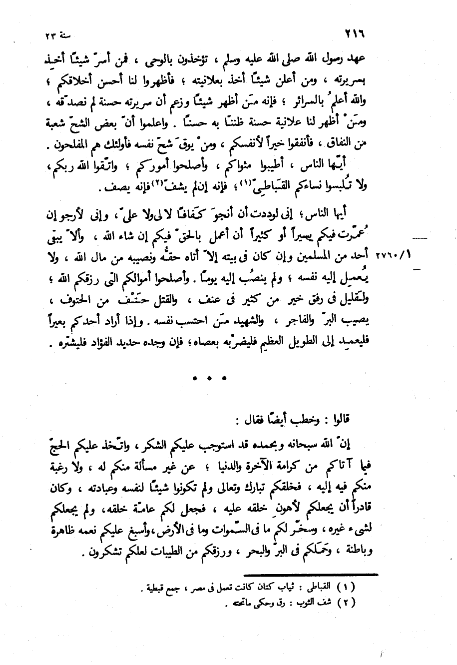 أَيُّهَا النَّاسُ، إِنِّي لَوَدِدْتُ أَنْ أَنْجُوَ كَفَافًا لا لِيَ وَلا عَلَيَّ، وَإِنِّي لأَرْجُو إِنْ عُمِّرْتُ فِيكُمْ يَسِيرًا أَوْ كَثِيرًا أَنْ أَعْمَلَ بِالْحَقِّ فِيكُمْ إِنْ شَاءَ اللَّهُ، وَأَلا يَبْقَى أَحَدٌ مِنَ الْمُسْلِمِينَ وَإِنْ كَانَ فِي بَيْتِهِ إِلا أَتَاهُ حَقُّهُ وَنَصِيبُهُ مِنْ مَالِ اللَّهِ، وَلا يَعْمَلُ إِلَيْهِ نَفْسَهُ، وَلَمْ يَنْصِبْ إِلَيْهِ يَوْمًا وَأَصْلِحُوا أَمْوَالَكُمُ الَّتِي رَزَقَكُمُ اللَّهُ، وَلَقَلِيلٌ فِي رِفْقٍ خَيْرٌ مِنْ كَثِيرٍ فِي عُنْفٍ، وَالْقَتْلُ حَتْفٌ مِنَ الْحُتُوفِ، يُصِيبُ الْبَرَّ وَالْفَاجِرَ، وَالشَّهِيدُ مَنِ احْتَسَبَ نَفْسَهُ وَإِذَا أَرَادَ أَحَدُكُمْ بَعِيرًا فَلْيَعْمِدْ إِلَى الطَّوِيلِ الْعَظِيمِ فَلْيَضْرِبْهُ بِعَصَاهُ، فَإِنْ وَجَدَهُ حَدِيدَ الْفُؤَادِ فَلْيَشْتَرِهِ قَالُوا: وَخَطَبَ أَيْضًا فَقَالَ: