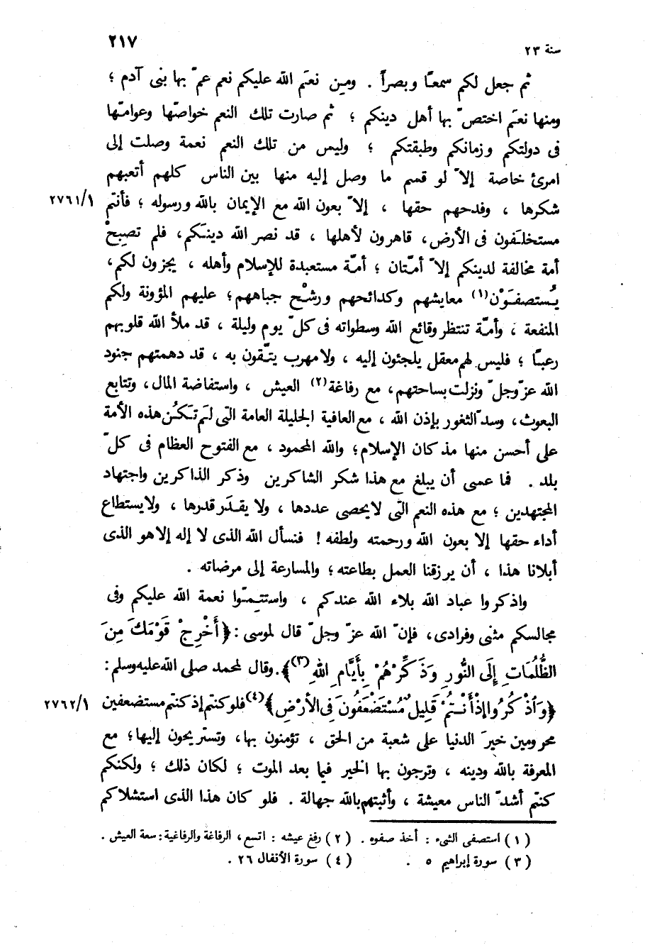 ثُمَّ جَعَلَ لَكُمْ سَمْعًا وَبَصَرًا وَمِنْ نِعَمِ اللَّهِ عَلَيْكُمْ نِعَمٌ عَمَّ بِهَا بَنِي آدَمَ، وَمِنْهَا نِعَمٌ اخْتَصَّ بِهَا أَهْلَ دِينِكُمْ، ثُمَّ صَارَتْ تِلْكَ النِّعَمُ خَوَاصُّهَا وَعَوَامُّهَا فِي دَوْلَتِكُمْ وَزَمَانِكُمْ وَطَبَقَتِكُمْ، وَلَيْسَ مِنْ تِلْكَ النِّعَمِ نِعْمَةٌ وَصَلَتْ إِلَى امْرِئٍ خَاصَّةً إِلا لَوْ قَسَمْ مَا وَصَلَ إِلَيْهِ مِنْهَا بَيْنَ النَّاسِ كُلِّهِمْ أَتْعَبَهُمْ شُكْرُهَا، وَفَدَحَهُمْ حَقُّهَا، إِلا بِعَوْنِ اللَّهِ مَعَ الإِيمَانِ بِاللَّهِ وَرَسُولِهِ، فَأَنْتُمْ مُسْتَخْلَفُونَ فِي الأَرْضِ، قَاهِرُونَ لأَهْلِهَا، قَدْ نَصَرَ اللَّهُ دِينَكُمْ، فَلَمْ تُصْبِحْ أُمَّةٌ مُخَالِفَةً لِدِينِكُمْ إِلا أُمَّتَانِ، أُمَّةٌ مُسْتَعْبَدَةٌ لِلإِسْلامِ وَأَهْلِهِ، يَجْزُونَ لَكُمْ، يَسْتَصِفُّونَ مَعَايِشَهُمْ وَكَدَائِحَهُمْ وَرُشْحٌ جِبَاهُهُمْ، عَلَيْهِمُ الْمَئُونَةُ وَلَكُمُ الْمَنْفَعَةُ، وَأُمَّةٌ تَنْتَظِرُ وَقَائِعَ اللَّهِ وَسَطْوَاتَهُ فِي كُلِّ يَوْمٍ وَلَيْلَةٍ، قَدْ مَلأَ اللَّهُ قُلُوبَهُمْ رُعْبًا، فَلَيْسَ لَهُمْ مَعْقِلٌ يَلْجَئُونَ إِلَيْهِ، وَلا مَهْرَبٌ يَتَّقُونَ بِهِ، قَدْ دَهِمَتْهُمْ جُنُودُ اللَّهِ عَزَّ وَجَلَّ وَنَزَلَتْ بِسَاحَتِهِمْ، مَعَ رَفَاغَةِ الْعَيْشِ، وَاسْتِفَاضَةِ الْمَالِ، وَتَتَابُعِ الْبُعُوثِ، وَسَدِّ الثُّغُورِ بِإِذْنِ اللَّهِ، مَعَ الْعَافِيَةِ الْجَلِيلَةِ الْعَامَّةِ الَّتِي لَمْ تَكُنْ هَذِهِ الأُمَّةُ عَلَى أَحْسَنَ مِنْهَا مُذْ كَانَ الإِسْلامُ، وَاللَّهُ الْمَحْمُودُ، مَعَ الْفُتُوحِ الْعِظَامِ فِي كُلِّ بَلَدٍ فَمَا عَسَى أَنْ يَبْلُغَ مَعَ هَذَا شُكْرُ الشَّاكِرِينَ وَذِكْرُ الذَّاكِرِينَ وَاجْتِهَادُ الْمُجْتَهِدِينَ، مَعَ هَذِهِ النِّعَمِ الَّتِي لا يُحْصَى عَدَدُهَا، وَلا يُقَدَّرُ قَدْرُهَا، وَلا يُسْتَطَاعُ أَدَاءُ حَقِّهَا إِلا بِعَوْنِ اللَّهِ وَرَحْمَتِهِ وَلُطْفِهِ! فَنَسْأَلُ اللَّهِ الَّذِي لا إِلَهَ إِلا هُوَ الَّذِي أَبْلانَا هَذَا، أَنْ يَرْزُقَنَا الْعَمَلَ بِطَاعَتِهِ، وَالْمُسَارَعَةَ إِلَى مَرْضَاتِهِ.