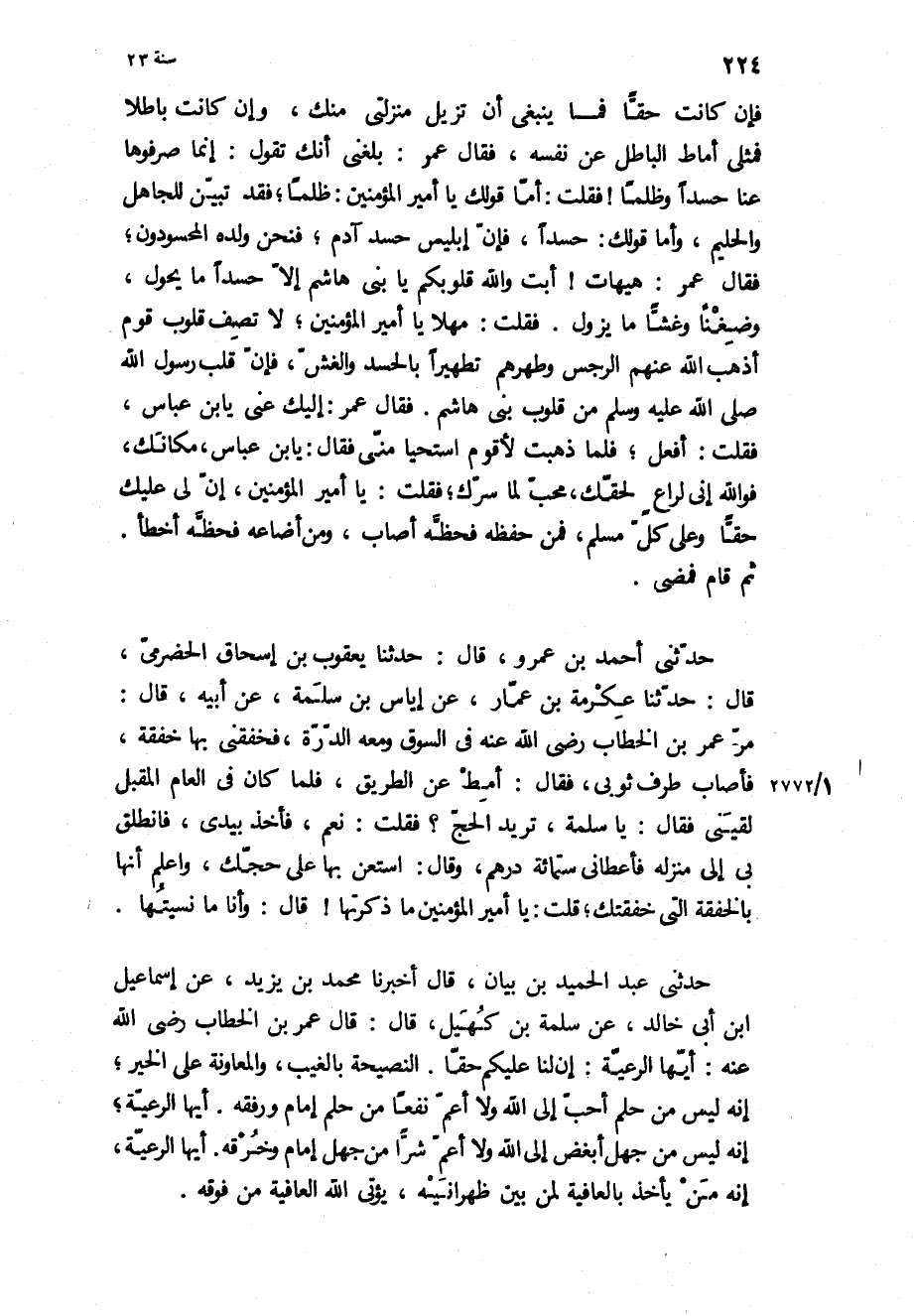 فَإِنْ كَانَتْ حَقًّا فَمَا يَنْبَغِي أَنْ تُزِيلَ مَنْزِلَتِي مِنْكَ، وَإِنْ كَانَتْ بَاطِلا فَمِثْلِي أَمَاطَ الْبَاطِلَ عَنْ نَفْسِهِ، فَقَالَ عُمَرُ: بَلَغَنِي أَنَّكَ تَقُولُ: إِنَّمَا صَرَفُوهَا عَنَّا حَسَدًا وَظُلْمًا! فَقُلْتُ: أَمَّا قَوْلُكَ يَا أَمِيرَ الْمُؤْمِنِينَ: ظُلْمًا، فَقَدْ تَبَيَّنَ لِلْجَاهِلِ وَالْحَلِيمِ، وَأَمَّا قَوْلُكَ: حَسَدًا، فَإِنَّ إِبْلِيسَ حَسَدَ آدَمَ، فَنَحْنُ وَلَدُهُ الْمَحْسُودُونَ، فَقَالَ عُمَرُ: هَيْهَاتَ! أَبَتْ وَاللَّهِ قُلُوبُكُمْ يَا بَنِي هَاشِمٍ إِلا حَسَدًا مَا يُحَوَّلُ، وَضِغْنًا وَغِشًّا مَا يَزُولُ فَقُلْتُ: مَهْلا يَا أَمِيرَ الْمُؤْمِنِينَ، لا تَصِفْ قُلُوبَ قَوْمٍ أَذْهَبَ اللَّهُ عَنْهُمُ الرِّجْسَ وَطَهَّرَهُمْ تَطْهِيراً بِالْحَسَدِ وَالْغِشِّ، فَإِنَّ قَلْبَ رسول الله ص مِنْ قُلُوبِ بَنِي هَاشِمٍ فَقَالَ عُمَرُ: إِلَيْكَ عنى يا بن عَبَّاسٍ، فَقُلْتُ: أَفْعَلُ، فَلَمَّا ذَهَبْتُ لأَقُومَ اسْتَحْيَا منى فقال: يا بن عباس، مكانك، فو الله إِنِّي لَرَاعٍ لِحَقِّكَ، مُحِبٌّ لِمَا سَرَّكَ، فَقُلْتُ: يَا أَمِيرَ الْمُؤْمِنِينَ، إِنَّ لِي عَلَيْكَ حَقًّا وعلى كل مسلم، فمن حفظه فحفظه أَصَابَ، وَمَنْ أَضَاعَهُ فَحَظُّهُ أَخْطَأَ.