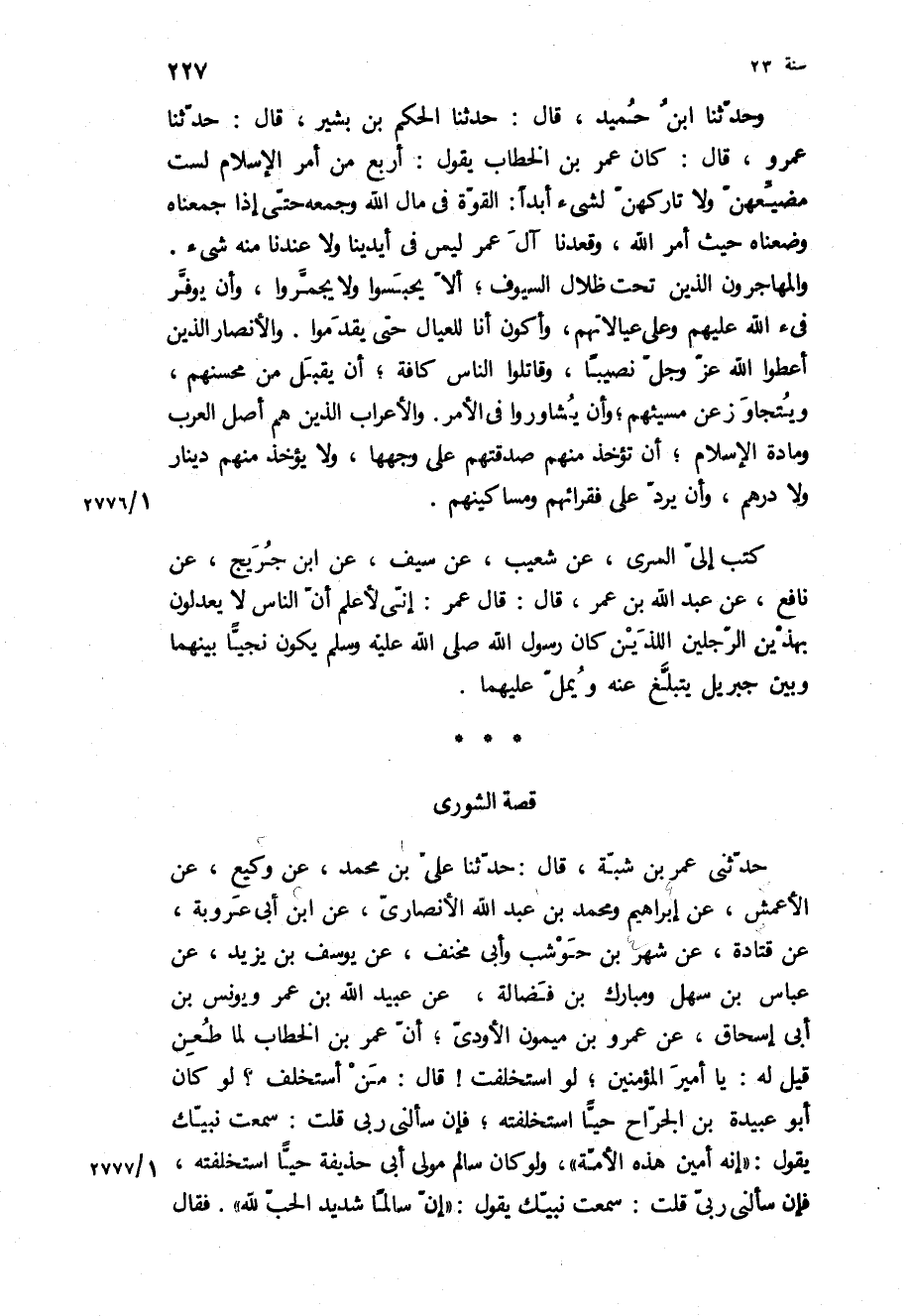 حَدَّثَنِي عُمَرُ بْنُ شبة، قال: حدثنا علي بن محمد، عن وَكِيعٍ، عَنِ الأَعْمَشِ، عَنْ إِبْرَاهِيمَ وَمُحَمَّدُ بْنُ عَبْدِ اللَّهِ الأَنْصَارِيِّ، عَنِ ابْنِ أَبِي عَرُوبَةَ، عن قتادة، عن شهر بن حوشب وابى مِخْنَفٍ، عَنْ يُوسُفَ بْنِ يَزِيدَ، عَنْ عَبَّاسِ بْنِ سَهْلٍ وَمُبَارَكُ بْنُ فَضَالَةَ، عَنْ عُبَيْدِ اللَّهِ بْنِ عُمَرَ وَيُونُسَ بْنِ أَبِي إِسْحَاقَ، عَنْ عَمْرِو بْنِ مَيْمُونٍ الأَوْدِيِّ، أَنَّ عُمَرَ بْنَ الْخَطَّاب لَمَّا طُعِنَ قِيلَ لَهُ: يَا أَمِيرَ الْمُؤْمِنِينَ، لَوِ اسْتَخْلَفْتَ! قَالَ: مَنْ أَسْتَخْلِفُ؟ [لَوْ كَانَ أَبُو عُبَيْدَةَ بْنُ الْجَرَّاحِ حَيًّا اسْتَخْلَفْتُهُ، فَإِنْ سَأَلَنِي رَبِّي قُلْتُ: سَمِعْتُ نَبِيَّكَ يَقُولُ: إِنَّهُ أَمِينُ هَذِهِ الأُمَّةُ، وَلَوْ كَانَ سَالِمٌ مَوْلَى أَبِي حُذَيْفَةَ حَيًّا اسْتَخْلَفْتُهُ، فَإِنْ سَأَلَنِي رَبِّي قُلْتُ: سَمِعْتُ نَبِيَّكَ يَقُولُ: إِنَّ سَالِمًا شَدِيدُ الْحُبِّ لِلَّهِ] فَقَالَ