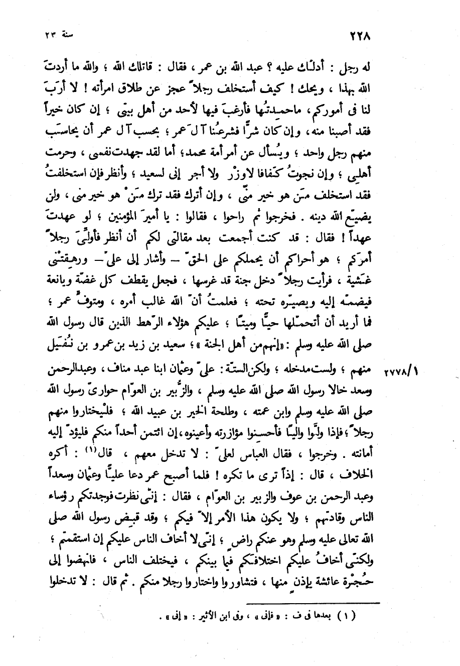 لَهُ رَجُلٌ: أَدُلُّكَ عَلَيْهِ؟ عَبْدُ اللَّهِ بْنُ عُمَرَ، فَقَالَ: قَاتَلَكَ اللَّهُ، وَاللَّهِ مَا أَرَدْتَ اللَّهَ بِهَذَا، وَيْحَكَ! كَيْفَ أَسْتَخْلِفُ رَجُلا عَجَزَ عَنْ طَلاقِ امْرَأَتِهِ! لا أَرَبَ لَنَا فِي أُمُورِكُمْ، مَا حَمِدْتُهَا فَأَرْغَبُ فِيهَا لأَحَدٍ مِنْ أَهْلِ بَيْتِي، إِنْ كَانَ خَيْرًا فَقَدْ أَصَبْنَا منه، وان كان شرا فشرعنا آل عُمَرَ، بِحَسْبِ آلِ عُمَرَ أَنْ يُحَاسَبَ مِنْهُمْ رَجُلٌ وَاحِدٌ، وَيُسْأَلَ عَنْ أَمْرِ أُمَّةِ مُحَمَّدٍ، أَمَا لَقَدْ جَهِدْتُ نَفْسِي، وَحَرَّمْتُ أَهْلِي، وَإِنْ نَجَوْتُ كَفَافًا لا وِزْرَ وَلا أَجْرَ إِنِّي لَسَعِيدٌ، وَانْظُرْ فَإِنِ اسْتَخْلَفْتُ فَقَدِ اسْتَخْلَفَ مَنْ هُوَ خَيْرٌ مِنِّي، وَإِنْ أَتْرُكُ فَقَدْ تَرَكَ مَنْ هُوَ خَيْرٌ مِنِّي، وَلَنْ يُضَيِّعَ اللَّهُ دِينَهُ فَخَرَجُوا ثُمَّ رَاحُوا، فَقَالُوا: يَا أَمِيرَ الْمُؤْمِنِينَ، لَوْ عَهِدْتَ عَهْدًا! فَقَالَ: قَدْ كُنْتُ أَجْمَعْتُ بَعْدُ مَقَالَتِي لَكُمْ أَنْ أَنْظُرَ فَأُوَلِّيَ رَجُلا أَمْرَكُمْ، هُوَ أَحْرَاكُمْ أَنْ يَحْمِلَكُمْ عَلَى الْحَقِّ- وَأَشَارَ إِلَى عَلِيٍّ- وَرَهَقَتْنِي غَشْيَةٌ، فَرَأَيْتُ رَجُلا دَخَلَ جَنَّةً قَدْ غَرَسَهَا، فَجَعَلَ يَقْطِفُ كُلَّ غَضَّةٍ وَيَانِعَةٍ فَيَضُمُّهُ إِلَيْهِ وَيُصَيِّرُهُ تَحْتَهُ، فَعَلِمْتُ أَنَّ اللَّهَ غَالِبٌ أَمْرَهُ، وَمُتَوَفٍّ عُمَرَ، فَمَا أُرِيدُ أَنْ أَتَحَمَّلَهَا حَيًّا وَمَيِّتًا، عَلَيْكُمْ هؤلاء الرهط الذين [قال رسول الله ص: إِنَّهُمْ مِنْ أَهْلِ الْجَنَّةِ،] سَعِيدُ بْنُ زَيْدِ بْنِ عَمْرِو بْنِ نُفَيْلٍ مِنْهُمْ، وَلَسْتُ مُدْخِلَهُ، وَلَكِنِ السِّتَّةُ: عَلِيٌّ وَعُثْمَانُ ابْنَا عَبْدِ مَنَافٍ، وعبد الرحمن وسعد خالا رسول الله ص، والزبير بن العوام حوارى رسول الله ص وَابْنُ عَمَّتِهِ، وَطَلْحَةُ الْخَيْرِ بْنُ عُبَيْدِ اللَّهِ، فَلْيَخْتَارُوا مِنْهُمْ رَجُلا، فَإِذَا وَلُّوا وَالِيًا فَأَحْسِنُوا مُؤَازَرَتَهُ وَأَعِينُوهُ، إِنِ ائْتَمَنَ أَحَدًا مِنْكُمْ فَلْيُؤَدِّ إِلَيْهِ أَمَانَتَهُ وَخَرَجُوا، فَقَالَ الْعَبَّاسُ لِعَلِيٍّ: لا تَدْخُلْ مَعَهُمْ، قَالَ: أَكْرَهُ الْخِلافَ، قَالَ: إِذًا تَرَى مَا تَكْرَهُ! فَلَمَّا أَصْبَحَ عُمَرُ دَعَا عَلِيًّا وَعُثْمَانَ وَسَعْدًا وَعَبْدَ الرَّحْمَنِ بْنَ عَوْفٍ وَالزُّبَيْرَ بْنَ الْعَوَّامِ، فَقَالَ: إِنِّي نَظَرْتُ فَوَجَدْتُكُمْ رُؤَسَاءَ النَّاسِ وَقَادَتَهُمْ، وَلا يَكُونُ هَذَا الأَمْرُ الا فيكم، وقد قبض رسول الله ص وَهُوَ عَنْكُمْ رَاضٍ، إِنِّي لا أَخَافُ النَّاسَ عَلَيْكُمْ إِنِ اسْتَقَمْتُمْ، وَلَكِنِّي أَخَافُ عَلَيْكُمُ اخْتِلافَكُمْ فِيمَا بَيْنَكُمْ، فَيَخْتَلِفَ النَّاسُ، فَانْهَضُوا إِلَى حُجْرَةِ عَائِشَةَ بِإِذْنٍ مِنْهَا، فَتَشَاوَرُوا وَاخْتَارُوا رَجُلا مِنْكُمْ ثُمَّ قَالَ: لا تَدْخُلُوا