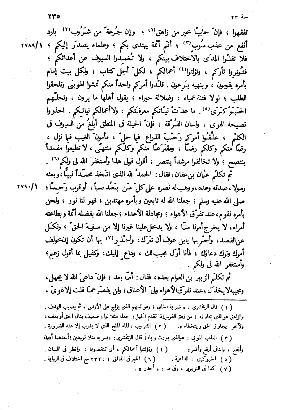 ثُمَّ تَكَلَّمَ الزُّبَيْرُ بْنُ الْعَوَّامِ بَعْدَهُ، فَقَالَ: أَمَّا بَعْدُ، فَإِنَّ دَاعِيَ اللَّهِ لا يُجْهَلُ، وَمُجِيبَهُ لا يُخْذَلُ، عِنْدَ تَفَرُّقِ الأَهْوَاءِ وَلَيِّ الأَعْنَاقِ، وَلَنْ يَقْصُرَ عَمَّا قُلْتُ إِلا غوى،