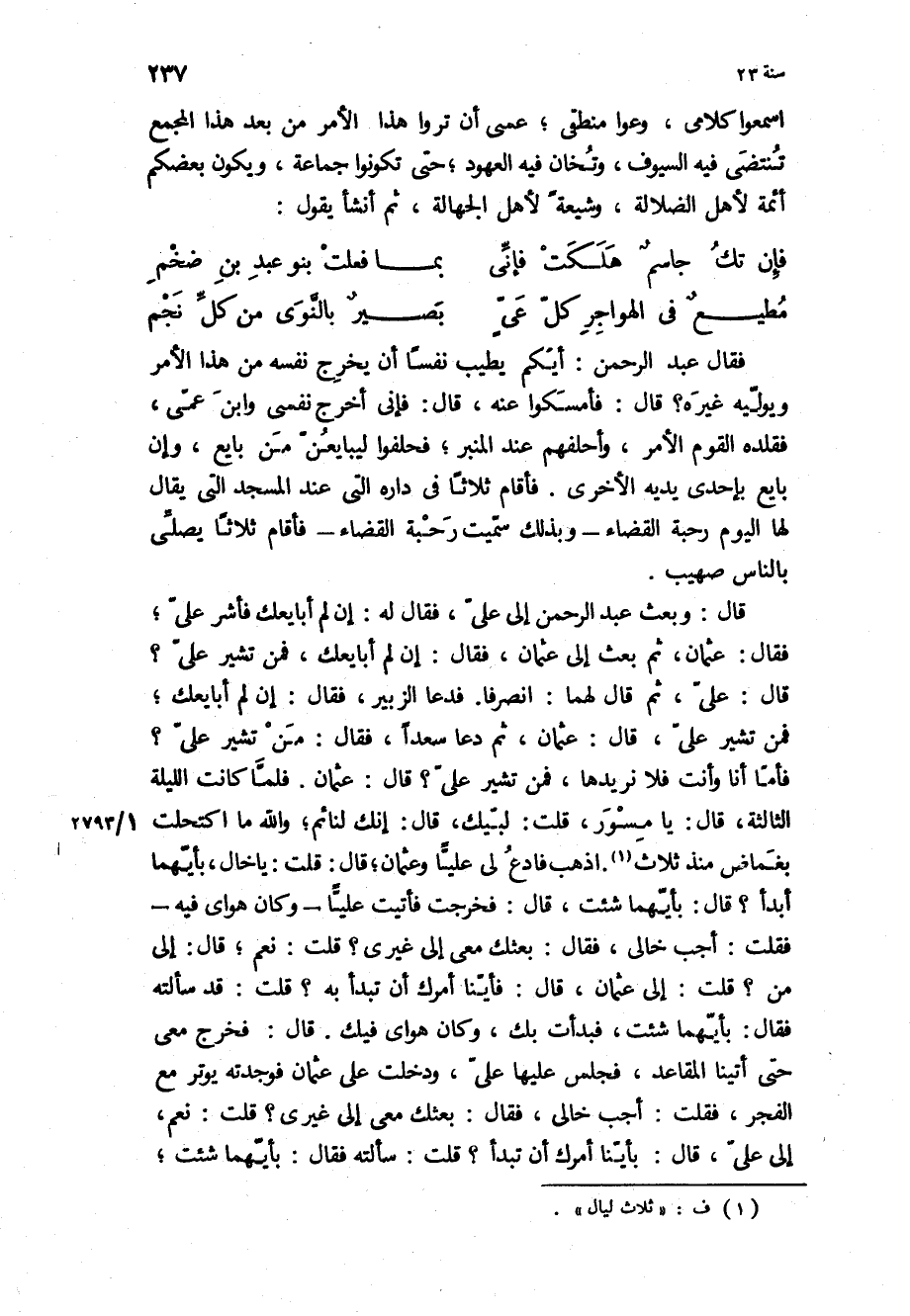 فَأَمَّا أَنَا وَأَنْتَ فَلا نُرِيدُهَا، فَمَنْ تُشِيرُ عَلَيَّ؟ قَالَ: عُثْمَانُ فَلَمَّا كَانَتِ اللَّيْلَةُ الثَّالِثَةُ، قَالَ: يَا مِسْوَرُ، قُلْتُ: لَبَّيْكَ، قَالَ: إِنَّكَ لَنَائِمٌ، وَاللَّهِ مَا اكْتَحَلْتُ بِغِمَاضٍ مُنْذُ ثَلاثٍ اذْهَبْ فَادْعُ لِي عَلِيًّا وَعُثْمَانَ، قَالَ: قُلْتُ: يَا خَالُ، بِأَيِّهِمَا أَبْدَأُ؟ قَالَ: بِأَيِّهِمَا شِئْتَ، قَالَ: فَخَرَجْتُ فَأَتَيْتُ عَلِيًّا- وَكَانَ هَوَايَ فِيهِ- فَقُلْتُ: أَجِبْ خَالِي، فَقَالَ: بَعَثَكَ مَعِي إِلَى غَيْرِي؟ قُلْتُ: نَعَمْ، قَالَ: إِلَى مَنْ؟ قُلْتُ: إِلَى عُثْمَانَ، قَالَ: فَأَيُّنَا أَمَرَكَ أَنْ تَبْدَأَ بِهِ؟ قُلْتُ: قَدْ سَأَلْتُهُ فَقَالَ: بِأَيِّهِمَا شِئْتَ، فَبَدَأْتُ بِكَ، وَكَانَ هَوَايَ فِيكَ قَالَ: فَخَرَجَ مَعِي حَتَّى أَتَيْنَا الْمَقَاعِدَ، فَجَلَسَ عَلَيْهَا عَلِيٌّ، وَدَخَلْتُ عَلَى عُثْمَانَ فَوَجَدَتْهُ يُوتِرُ مَعَ الْفَجْرِ، فَقُلْتُ: أَجِبْ خَالِي، فَقَالَ: بَعَثَكَ مَعِي إِلَى غَيْرِي؟ قُلْتُ: نَعَمْ، إِلَى عَلِيٍّ، قَالَ: بِأَيِّنَا أَمَرَكَ أَنْ تَبْدَأَ؟ قُلْتُ: سَأَلْتُهُ فَقَالَ: بِأَيِّهِمَا شِئْتَ،