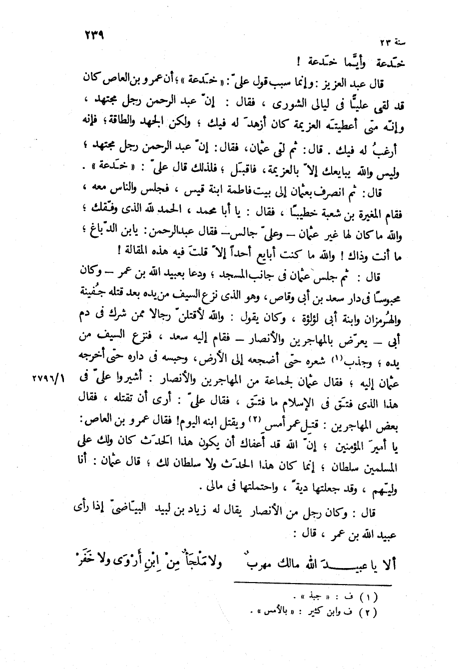 قَالَ: ثُمَّ انْصَرَفَ بِعُثْمَانَ إِلَى بَيْتِ فَاطِمَةَ ابْنَةِ قَيْسٍ، فَجَلَسَ وَالنَّاسُ مَعَهُ، فَقَامَ الْمُغِيرَةُ بْنُ شُعْبَةَ خَطِيبًا، فَقَالَ: يَا أَبَا مُحَمَّدٍ، الْحَمْدُ لِلَّهِ الَّذِي وَفَّقَكَ، وَاللَّهِ مَا كَانَ لَهَا غَيْرُ عُثْمَانَ- وَعَلِيٌّ جَالِسٌ- فَقَالَ عَبْدُ الرحمن: يا بن الدَّبَّاغِ، مَا أَنْتَ وَذَاكَ! وَاللَّهِ مَا كُنْتُ أُبَايِعُ أَحَدًا إِلا قُلْتَ فِيهِ هَذِهِ الْمَقَالَةَ! قَالَ: ثُمَّ جَلَسَ عُثْمَانُ فِي جَانِبِ الْمَسْجِدِ، ودعا بعبيد اللَّهِ بْنَ عُمَرَ- وَكَانَ مَحْبُوسًا فِي دَارِ سَعْدِ بْنِ أَبِي وَقَّاصٍ، وَهُوَ الَّذِي نَزَعَ السَّيْفَ مِنْ يَدِهِ بَعْدَ قَتْلِهِ جُفَيْنَةَ وَالْهُرْمُزَانَ وَابْنَةَ أَبِي لُؤْلُؤَةَ، وَكَانَ يَقُولُ: وَاللَّهِ لأَقْتُلَنَّ رِجَالا مِمَّنْ شَرِكَ فِي دَمِ أَبِي- يُعَرِّضُ بِالْمُهَاجِرِينَ وَالأَنْصَارِ- فَقَامَ إِلَيْهِ سَعْدٌ، فَنَزَعَ السَّيْفَ مِنْ يَدِهِ، وَجَذَبَ شَعْرَهُ حَتَّى أَضْجَعَهُ إِلَى الأَرْضِ، وَحَبَسَهُ فِي دَارِهِ حَتَّى أَخْرَجَهُ عُثْمَانُ إِلَيْهِ، فَقَالَ عُثْمَانُ لِجَمَاعَةٍ مِنَ الْمُهَاجِرِينَ وَالأَنْصَارِ: أَشِيرُوا عَلَيَّ فِي هَذَا الَّذِي فَتَقَ فِي الإِسْلامِ مَا فَتَقَ، فَقَالَ عَلِيٌّ: أَرَى أَنْ تَقْتُلَهُ، فَقَالَ بَعْضُ الْمُهَاجِرِينَ: قُتِلَ عُمَرُ أَمْسَ وَيُقْتَلُ ابْنُهُ الْيَوْمَ! فَقَالَ عَمْرُو بْنُ الْعَاصِ: