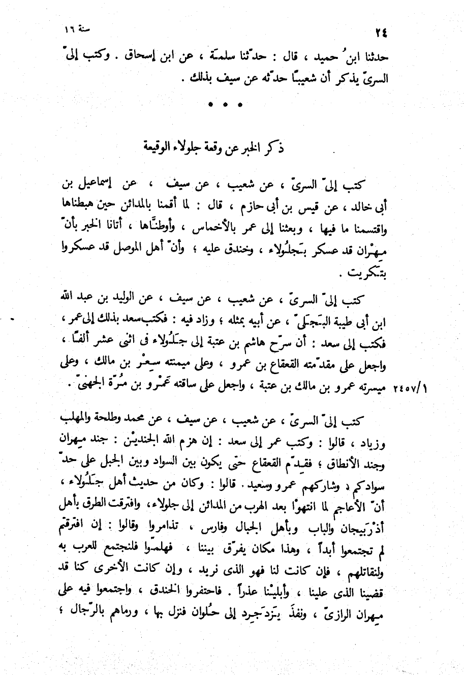 كَتَبَ إِلَيَّ السري، عن شعيب، عن سيف، عن الوليد بن عبد الله ابن أبي طيبة البجلي، عن أبيه بمثله، وزاد فيه: فكتب سعد بذلك إلى عمر، فكتب إلى سعد: أن سرح هاشم بْن عتبة إلى جلولاء في اثني عشر ألفا، واجعل على مقدمته القعقاع بْن عمرو، وعلى ميمنته سعر بْن مالك، وعلى ميسرته عمرو بْن مالك بْن عتبة، واجعل على ساقته عمرو بْن مرة الجهني.