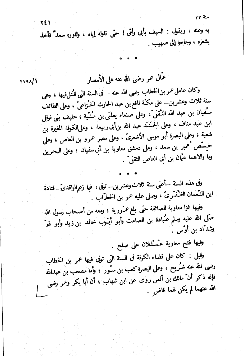 وَكَانَ عامل عُمَر بن الْخَطَّابِ رَضِيَ اللَّهُ عَنْهُ- فِي السنة الَّتِي قتل فِيهَا، وَهِيَ سنة ثلاث وعشرين- عَلَى مكة نافع بن عبد الْحَارِث الخزاعي، وعلى الطائف سُفْيَان بن عَبْدِ اللَّهِ الثقفي، وعلى صنعاء يعلى بن منيه، حليف بنى نوفل ابن عبد مناف، وعلى الجند عَبْد اللَّهِ بن أَبِي رَبِيعَةَ، وعلى الْكُوفَة الْمُغِيرَة بن شُعْبَةَ، وعلى الْبَصْرَةِ أَبُو مُوسَى الأَشْعَرِيّ، وعلى مصر عمرو بن العاص، وعلى حمص عمير بن سَعْدٍ، وعلى دمشق مُعَاوِيَة بن أَبِي سُفْيَانَ، وعلى البحرين وما والاهما عُثْمَان بن أبي العاص الثقفي.