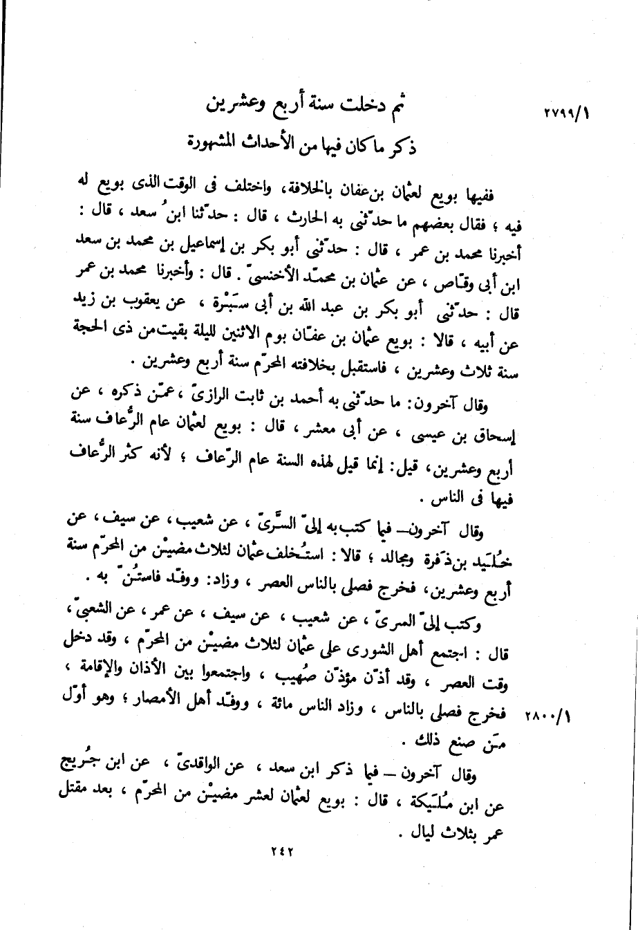 وَقَالَ آخرون- فيما كتب به إلي السري، عن شعيب، عَنْ سَيْفٍ، عن خليد بن ذفرة ومجالد، قالا: استخلف عثمان لثلاث مضين من المحرم سنة أربع وعشرين، فخرج فصلى بالناس العصر، وزاد: ووفد فاستن بِهِ.
