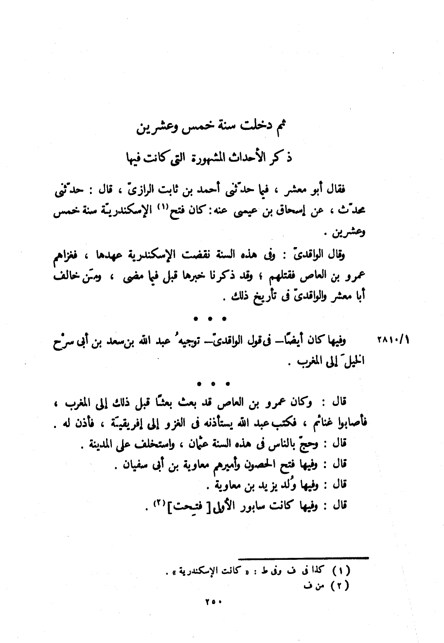 فَقَالَ أَبُو معشر، فِيمَا حَدَّثَنِي أَحْمَدُ بْن ثَابِت الرازي، قَالَ: حَدَّثَنِي محدث، عن إسحاق بن عيسى عنه: كان فتح الإسكندرية سنة خمس وعشرين.