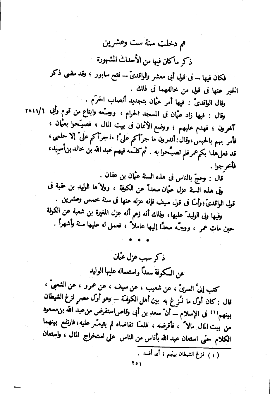 وفي هَذِهِ السنة عزل عُثْمَان سعدا عن الْكُوفَة، وولاها الْوَلِيد بن عُقْبَةَ فِي قول الْوَاقِدِيّ، وأما فِي قول سيف فإنه عزله عنها فِي سنة خمس وعشرين.