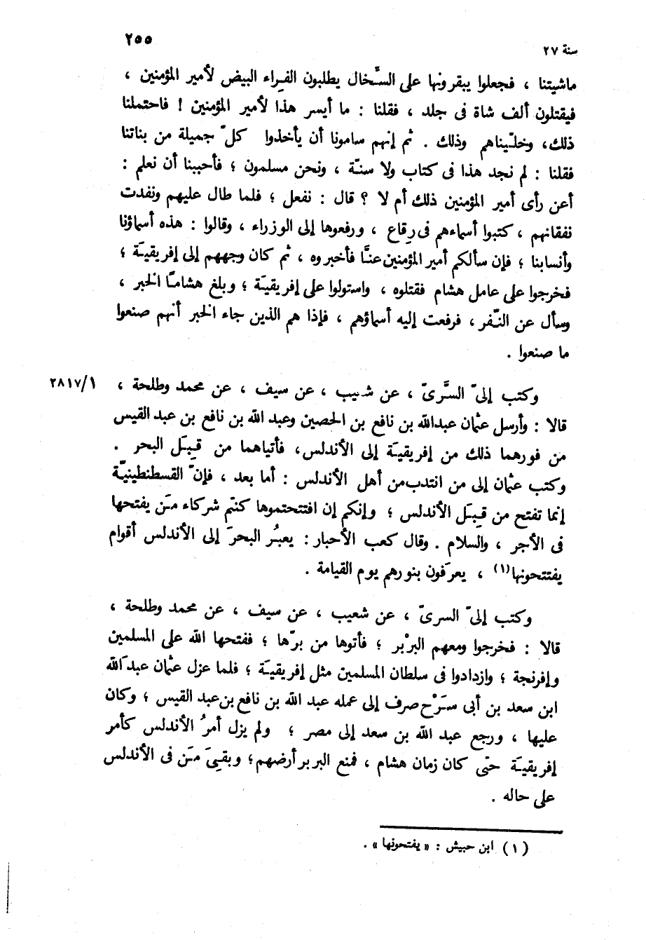 وَكَتَبَ إِلَيَّ السَّرِيُّ، عن شعيب، عن سيف، عن محمد وطلحة، قَالا: فخرجوا ومعهم البربر، فأتوها من برها، ففتحها اللَّه عَلَى الْمُسْلِمِينَ وإفرنجة، وازدادوا فِي سلطان الْمُسْلِمِينَ مثل إفريقية، فلما عزل عُثْمَان عبد الله ابن سَعْدِ بْنِ أبي سرح صرف إِلَى عمله عَبْدَ اللَّهِ بْنَ نَافِعِ بْنِ عَبْدِ الْقَيْسِ، وَكَانَ عَلَيْهَا، ورجع عَبْد اللَّهِ بن سَعْد إِلَى مصر، ولم يزل أمر الأندلس كأمر إفريقية حَتَّى كَانَ زمان هِشَام، فمنع البربر أرضهم، وبقي من فِي الأندلس عَلَى حاله